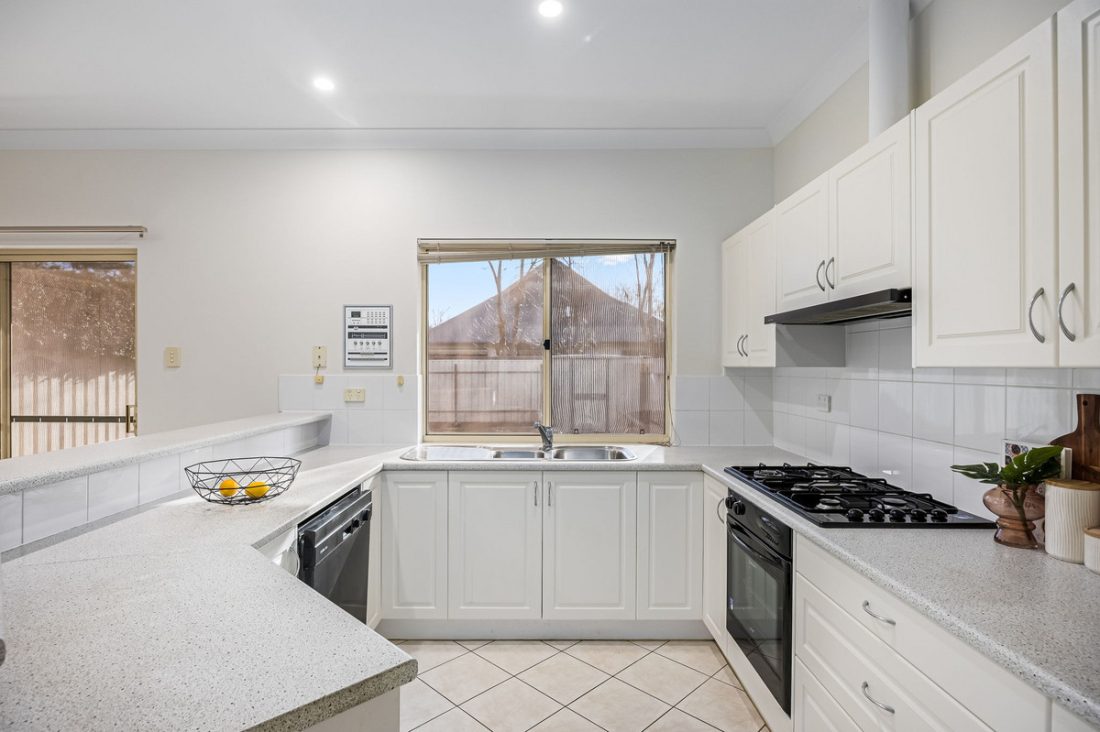 Head down the hallway to a sun-drenched lounge, where floor-to-ceiling glass doors open onto a private internal courtyard—perfect for morning coffees or evening wind-downs. Continue through to the open-plan kitchen and meals area, where country-style cabinetry meets modern convenience. Think generous bench space, stainless-steel appliances, and a gas cooktop that makes everyday cooking a breeze.