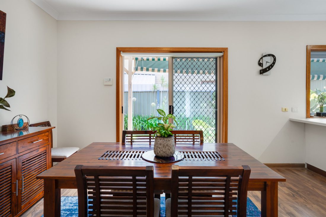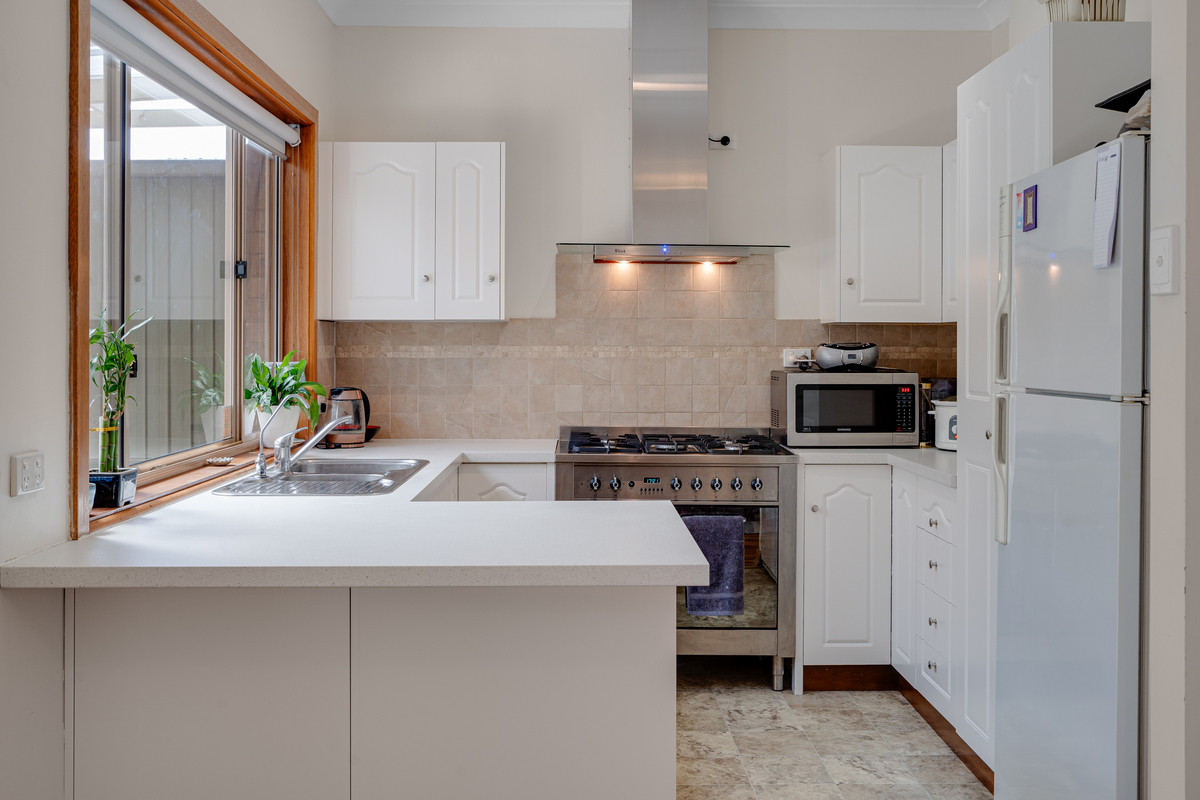 The heart of the home revolves around the central kitchen hub, equipped with stainless-steel oven, gas cooktop, tiled splashback, and ample cabinetry for storage. Adjacent to the kitchen, an attached dining/living space with an abundance of natural light accommodates the whole family comfortably.