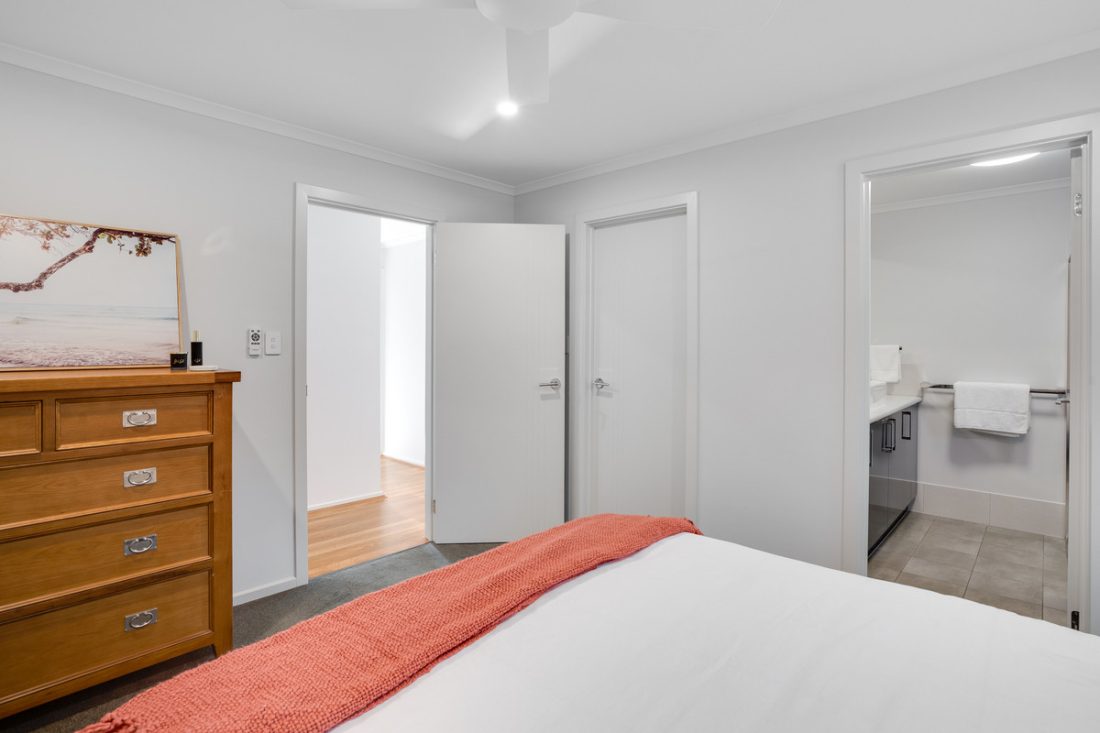 Venture inside to discover three spacious bedrooms, each featuring plush carpeting and ceiling fans. The master bedroom, thoughtfully separated at the front of the home, stands out with a walk-in robe and ensuite, offering a true retreat for the homeowners.