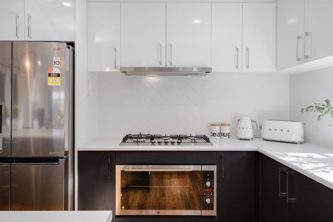 Continue down the hallway to the heart of this residence, where the open-plan kitchen, living, and dining areas combine, forming an open and welcoming space. The pristine kitchen boasts a walk-in pantry, stainless steel appliances including a gas cook-top, ample counter space, feature pendant lights, and a chic herringbone tiled backsplash.