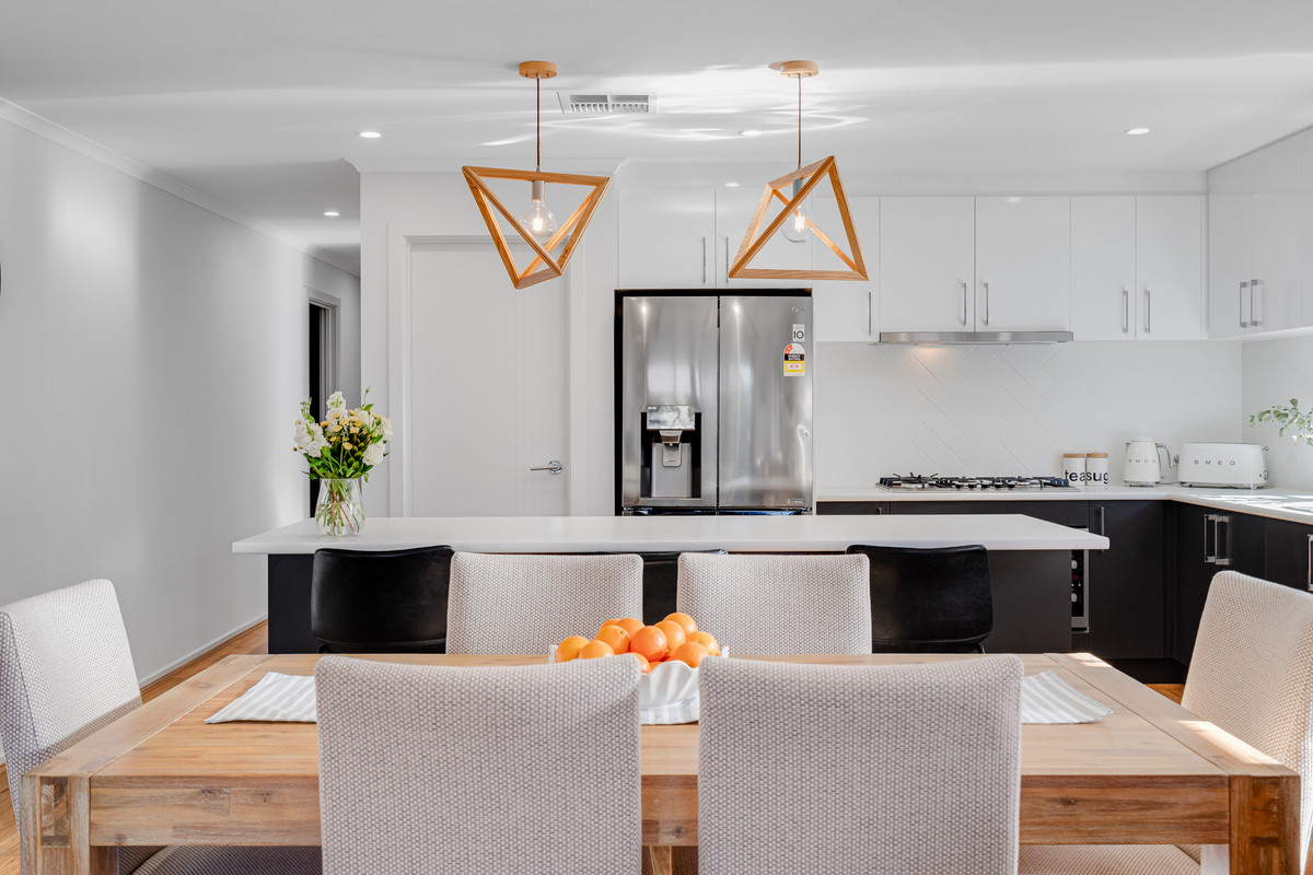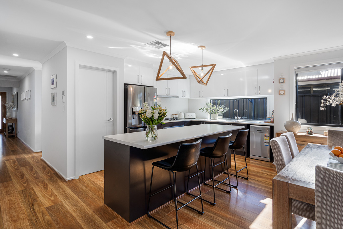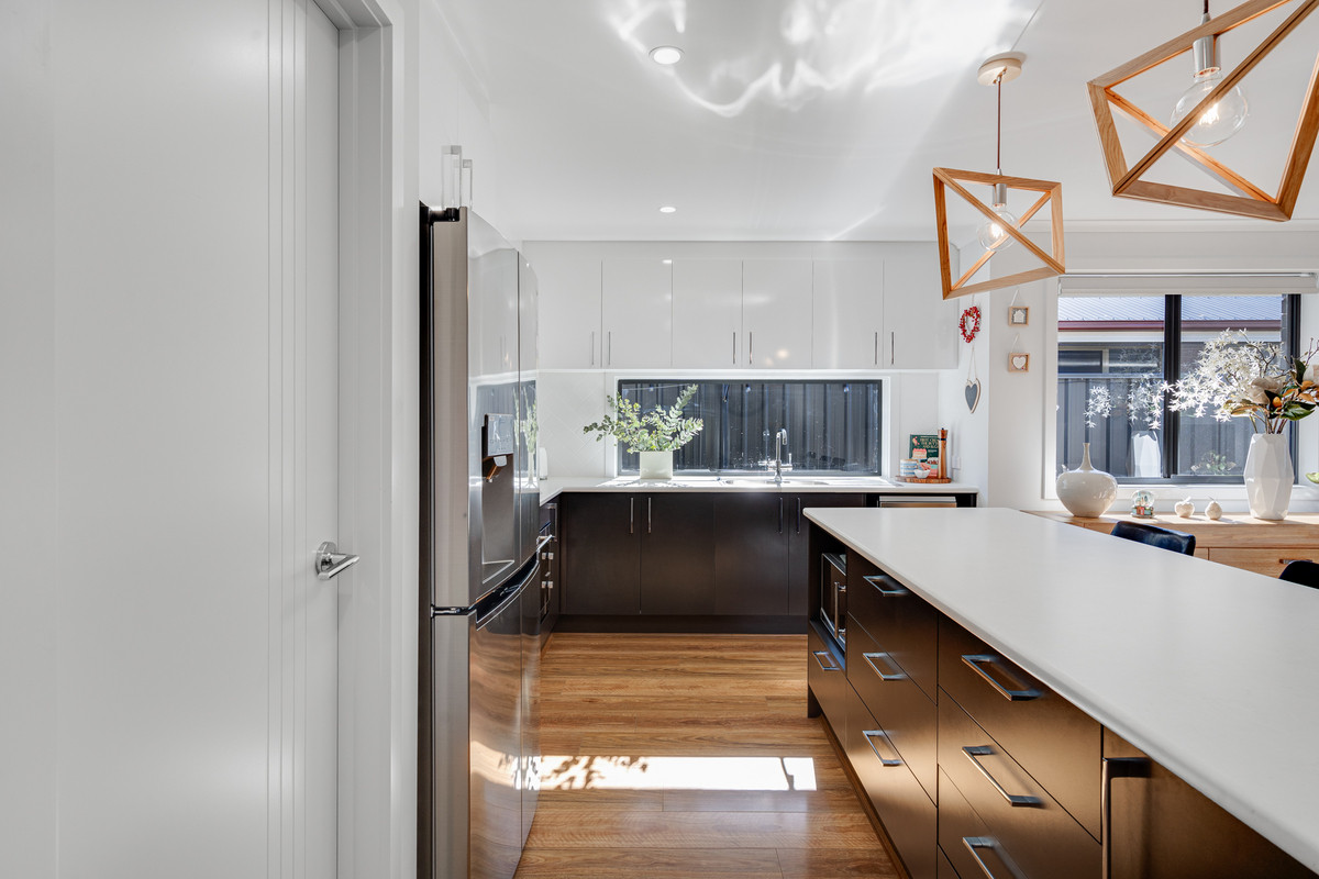 Continue down the hallway to the heart of this residence, where the open-plan kitchen, living, and dining areas combine, forming an open and welcoming space. The pristine kitchen boasts a walk-in pantry, stainless steel appliances including a gas cook-top, ample counter space, feature pendant lights, and a chic herringbone tiled backsplash.