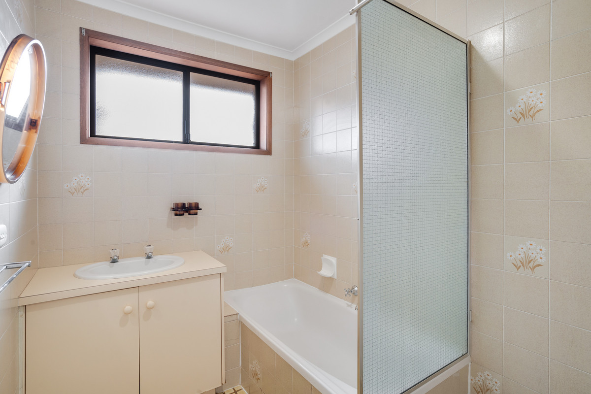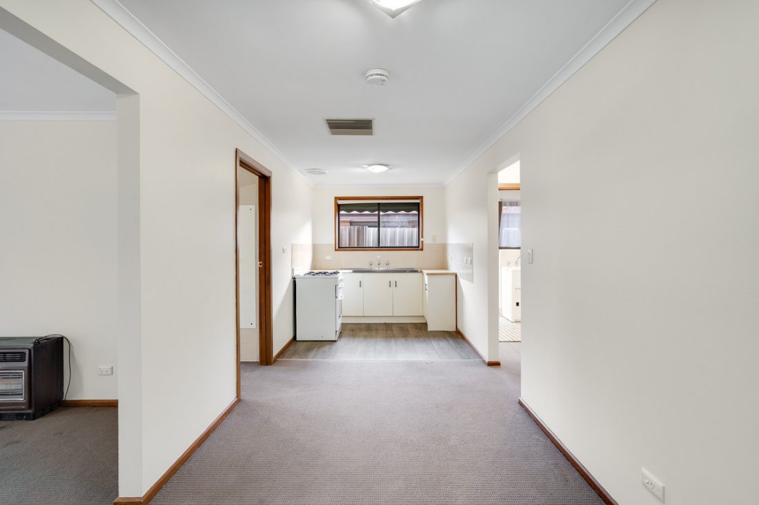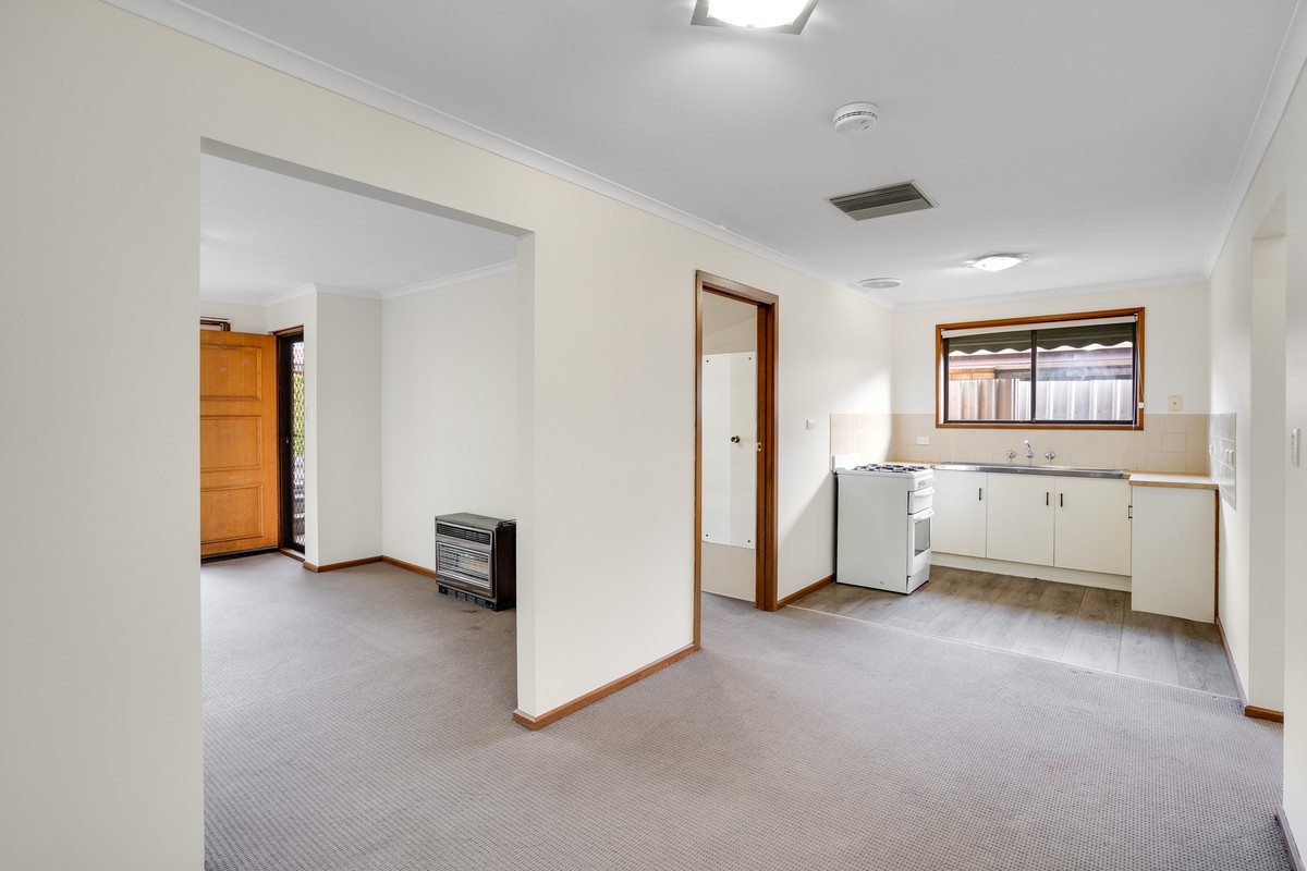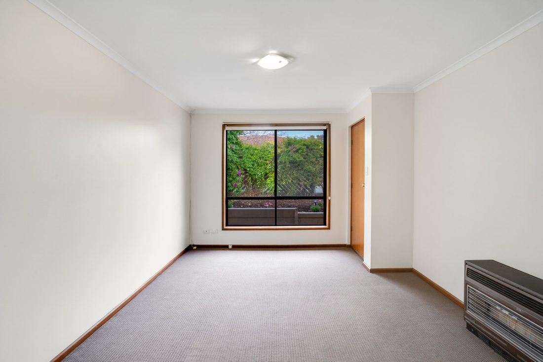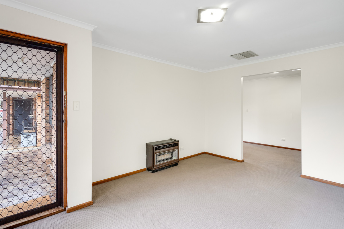 Upon entering, you are greeted by a cozy front lounge room, complete with plush carpet, a gas heater, and an oversized window offering a leafy view of the front garden.