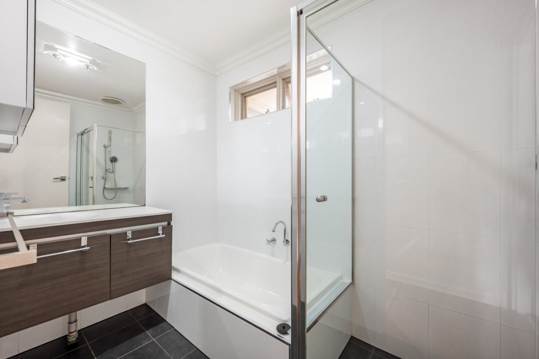 The bathroom is centrally located, designed for both practicality and comfort, featuring modern cabinets and crisp white tiles that create a fresh and contemporary feel.