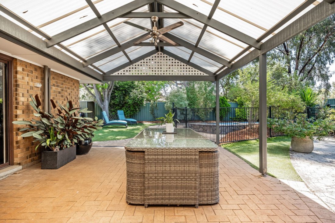– Outdoor entertaining area under a gabled pergola with a ceiling fan, overlooking an inground swimming pool and a spacious lawn