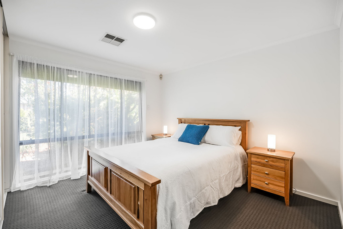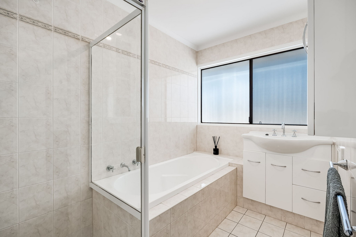 This home offers three generously sized bedrooms, each with plush carpeting for a comfortable and inviting atmosphere. The master bedroom, located at the front of the home, features a built-in robe and private ensuite, while bedroom three also includes a built-in robe. The main bathroom is immaculately maintained with floor-to-ceiling tiles, a bathtub, shower, vanity, and a separate toilet for added convenience.