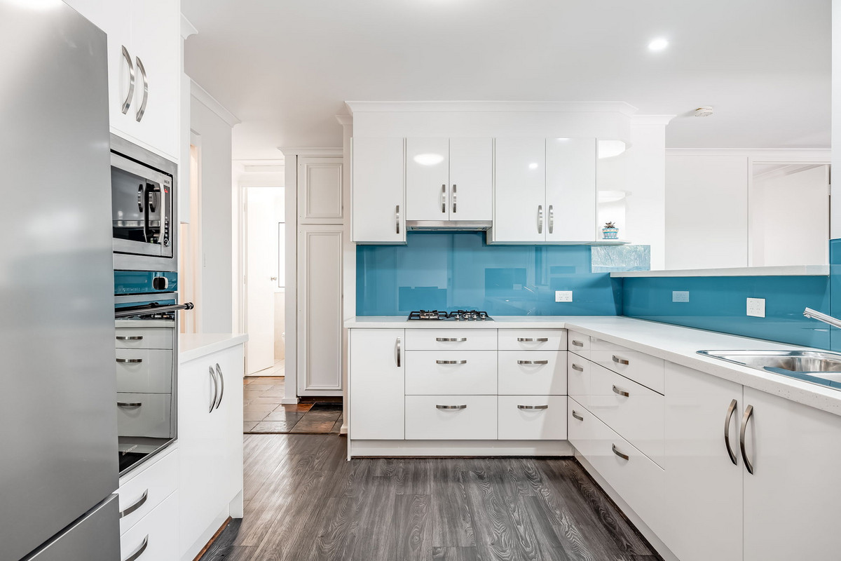The kitchen boasts crisp white cabinetry, a gas cooktop, wall oven, inbuilt microwave, dishwasher, stone benchtops and a chic splashback, making it a pleasure to cook and entertain.