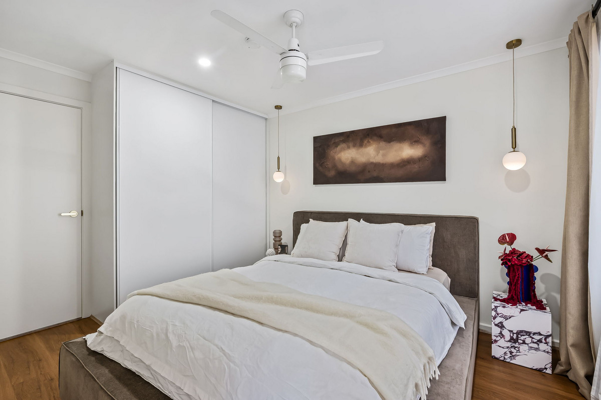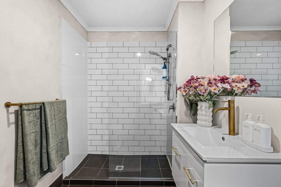 Both bedrooms are complete with built-in robes and ceiling fans for year-round ease, while the bathroom ties in the contemporary palette with a spacious subway tiled shower, great storage and sleek gold fixtures.