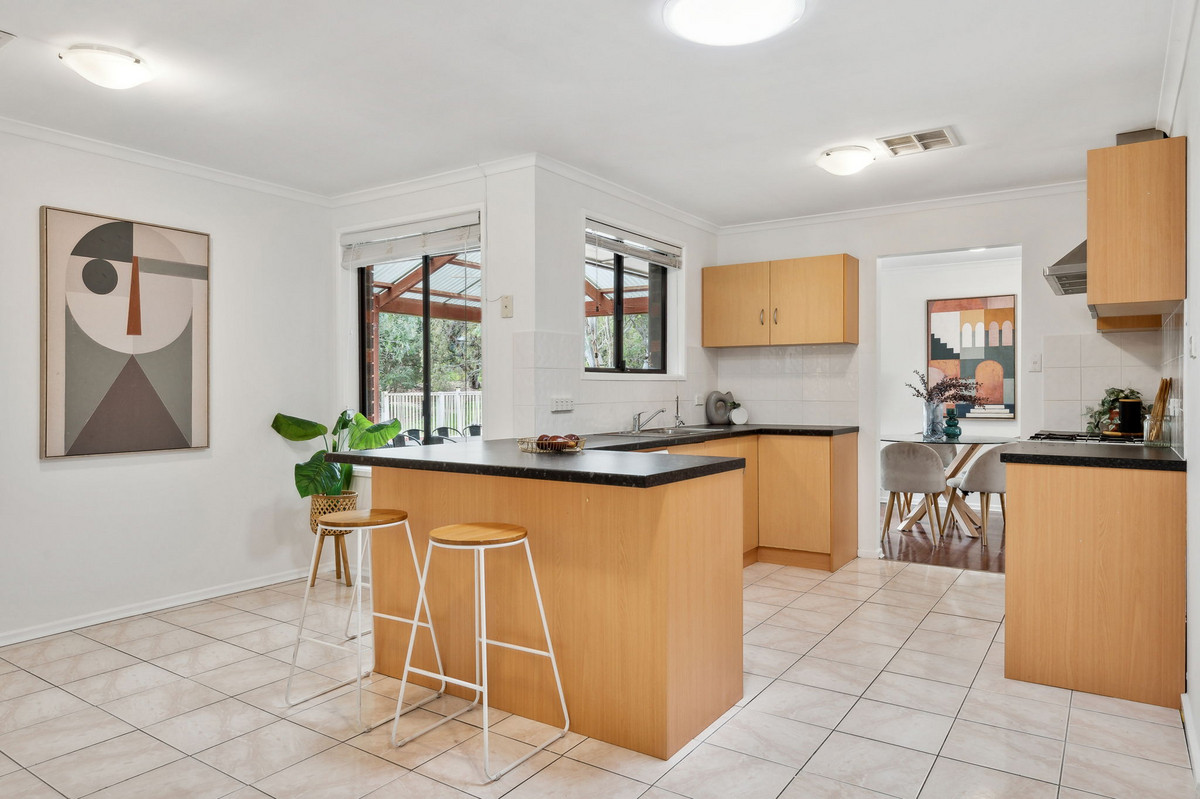 Step inside to the light-filled open-plan living and dining area, where stylish flooring and ample natural light create an inviting atmosphere. Flow through to the heart of the home, where a second spacious living area awaits, along with the updated kitchen. The kitchen features contemporary cabinetry, a tiled backsplash, a gas cooktop, and a breakfast bar perfect for casual meals.