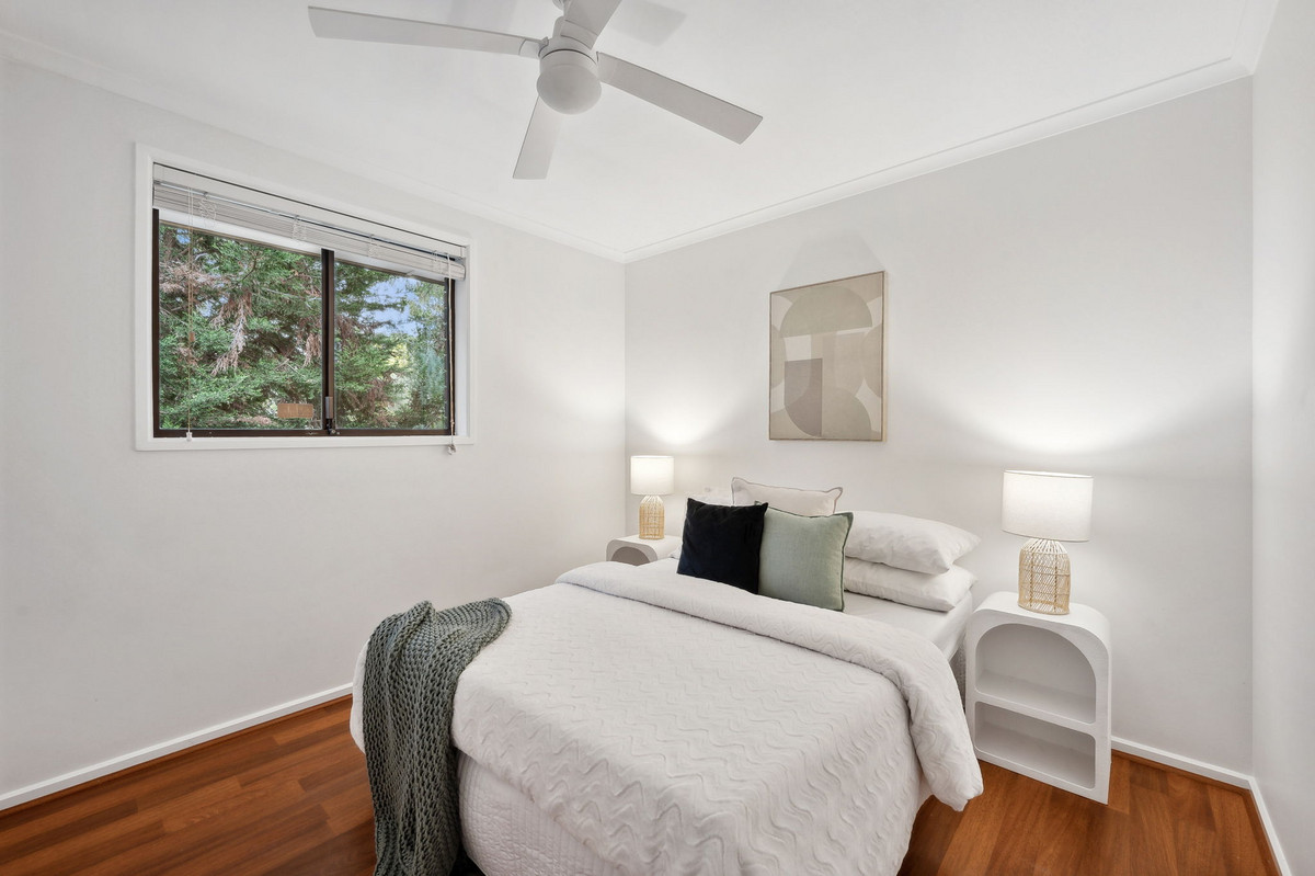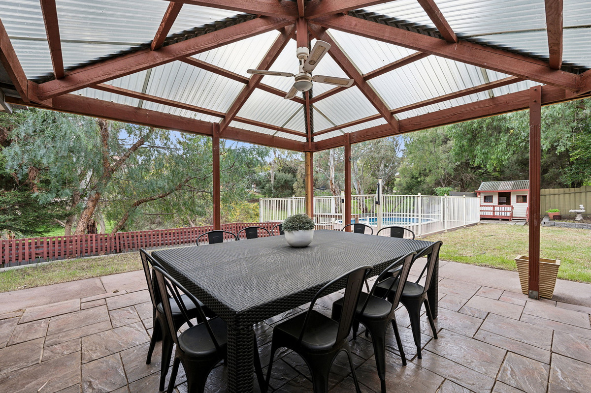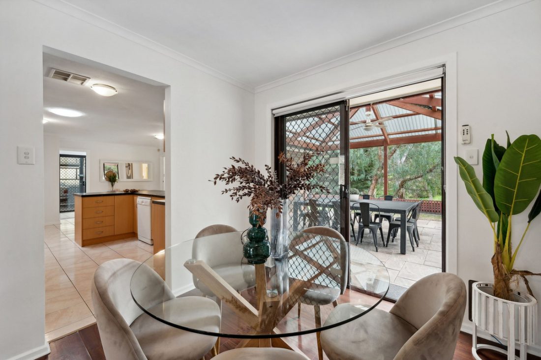 From the dining area, glass sliding doors open to a fantastic entertainment space, featuring a large pergola with a ceiling fan—ideal for summer barbecues. Beyond, the inviting pool enjoys surrounding decking and overlooks a leafy reserve, which feels like an extension of your backyard. A generous stretch of lawn offers plenty of room for children and pets to play or for soaking up the sunshine, making this the ultimate summer hangout spot.
