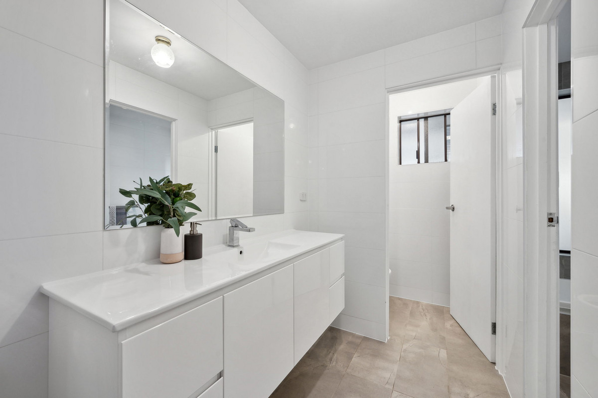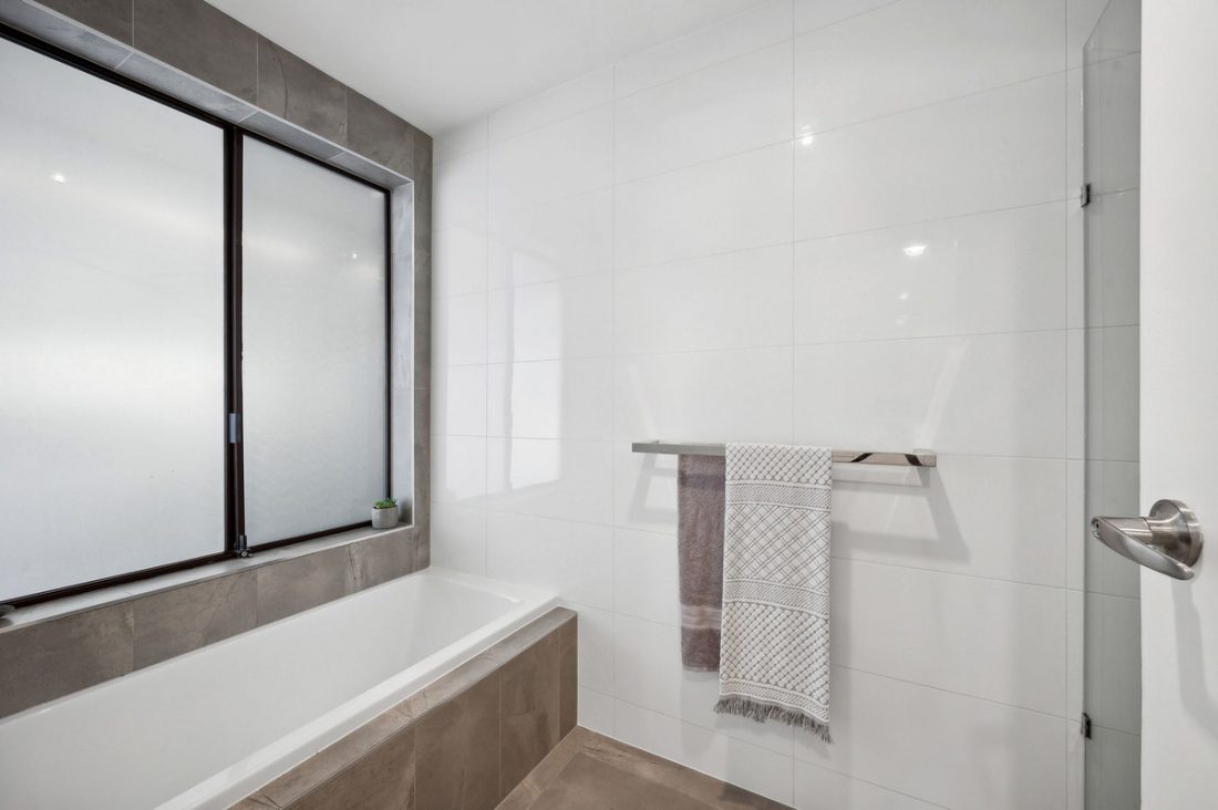 The beautifully renovated bathroom offers a functional three-way layout with floor-to-ceiling tiling, a large floating vanity, a built-in bath, a sleek frameless shower, and a separate toilet.