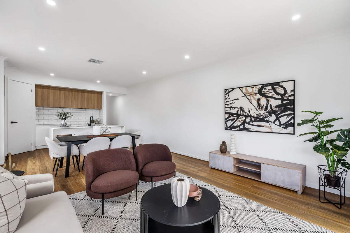 Glass sliding doors connect seamlessly to the backyard, where an undercover pergola sets the scene for easy entertaining, complemented by artificial turf that keeps upkeep to a minimum – just how low-maintenance living should be.