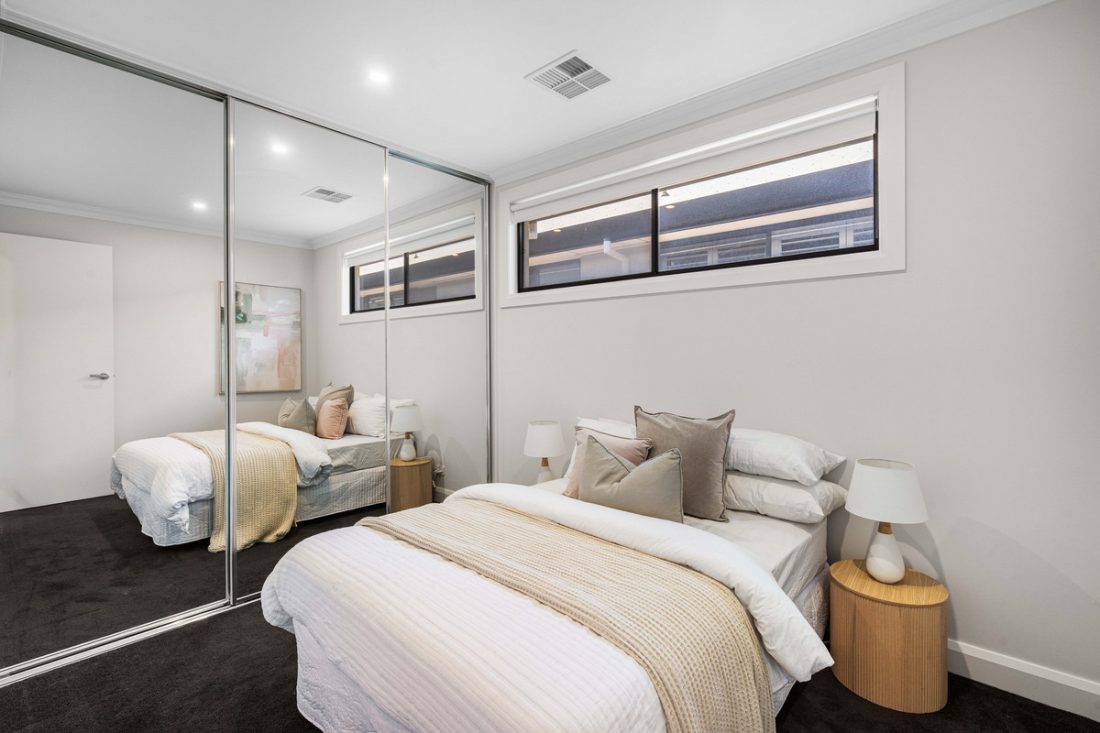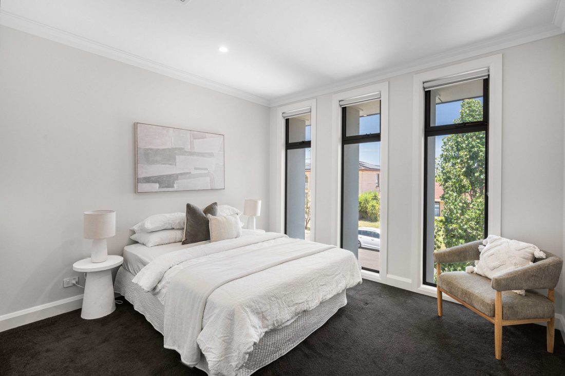 Upstairs, three bedrooms are joined by an additional living area – ideal for a second lounge, kids’ retreat or work-from-home setup. The master bedroom steps things up with a walk-in robe and sleek ensuite featuring a double vanity and floor-to-ceiling tiling. The remaining bedrooms include built-in robes and are serviced by a luxe main bathroom with floor-to-ceiling tiling and a freestanding bath.