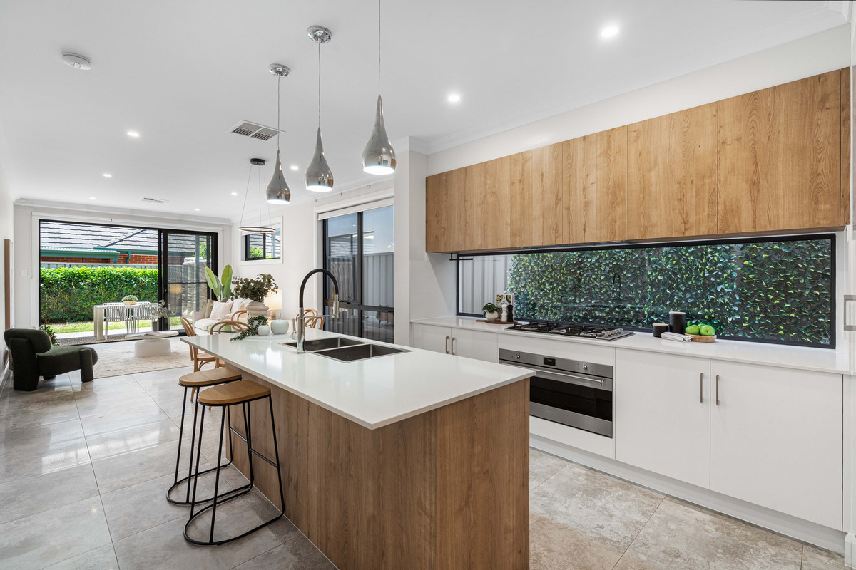Step inside and follow the hallway through to a light-filled open-plan kitchen, living and dining zone – a space made for everyday living and effortless entertaining. The kitchen ticks both style and function boxes, featuring a generous island bench with double sink, 20mm Caesarstone bench-tops, two-toned cabinetry, glass splashback, feature pendant lighting and stainless steel Smeg appliances, including a 900mm gas cooktop.