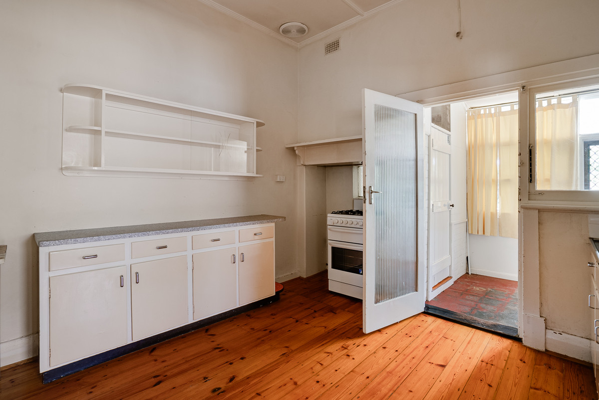 The central hub of the home is a spacious kitchen, ready for your personal touch. Equipped with a gas cooktop, electric oven, and retro-style kitchen cabinetry, it provides a functional space to unleash your culinary creativity.
