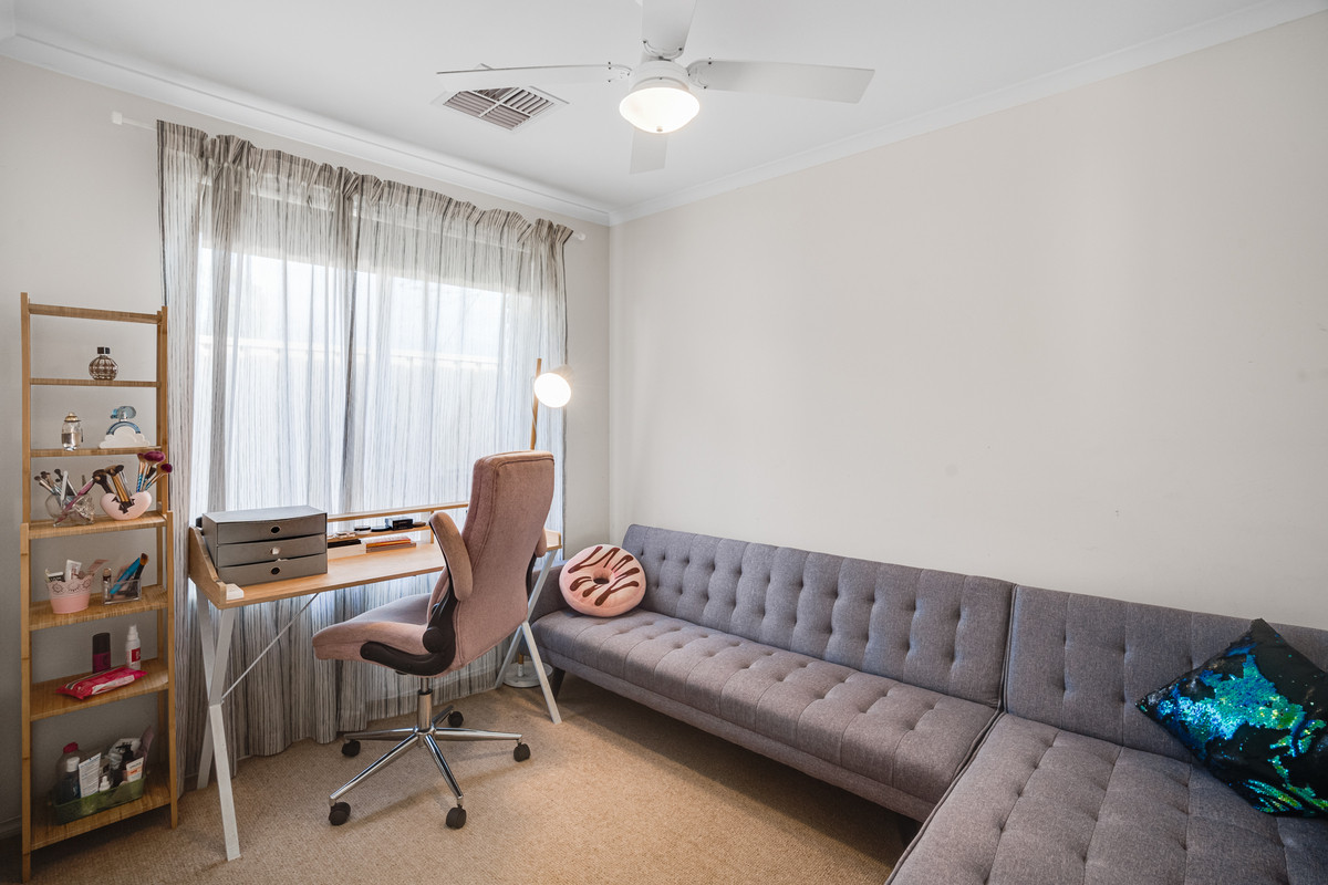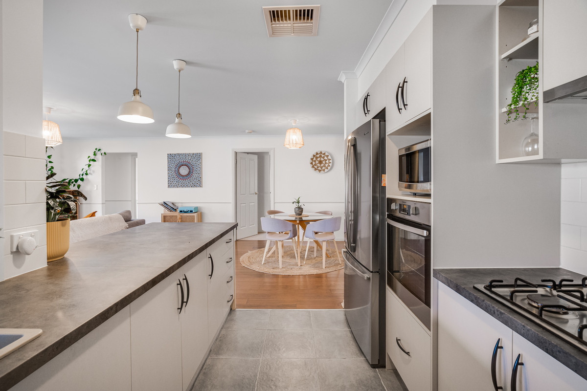 A separate formal, front lounge room offers versatility and can easily be transformed into a fourth bedroom, home office, or simply a cozy spot for family movie nights. The stylish, centralised kitchen is a true highlight, featuring a breakfast bar, gas cooktop, and quality, stainless-steel appliances.