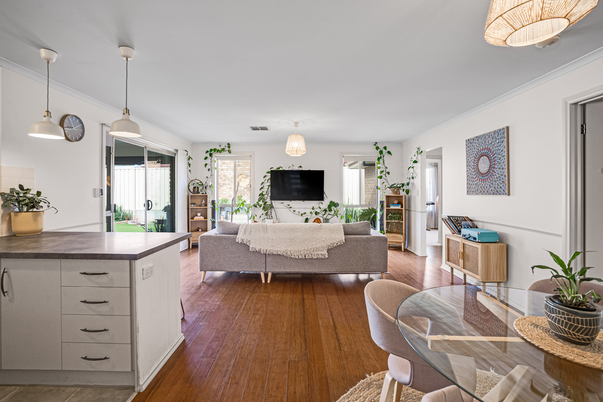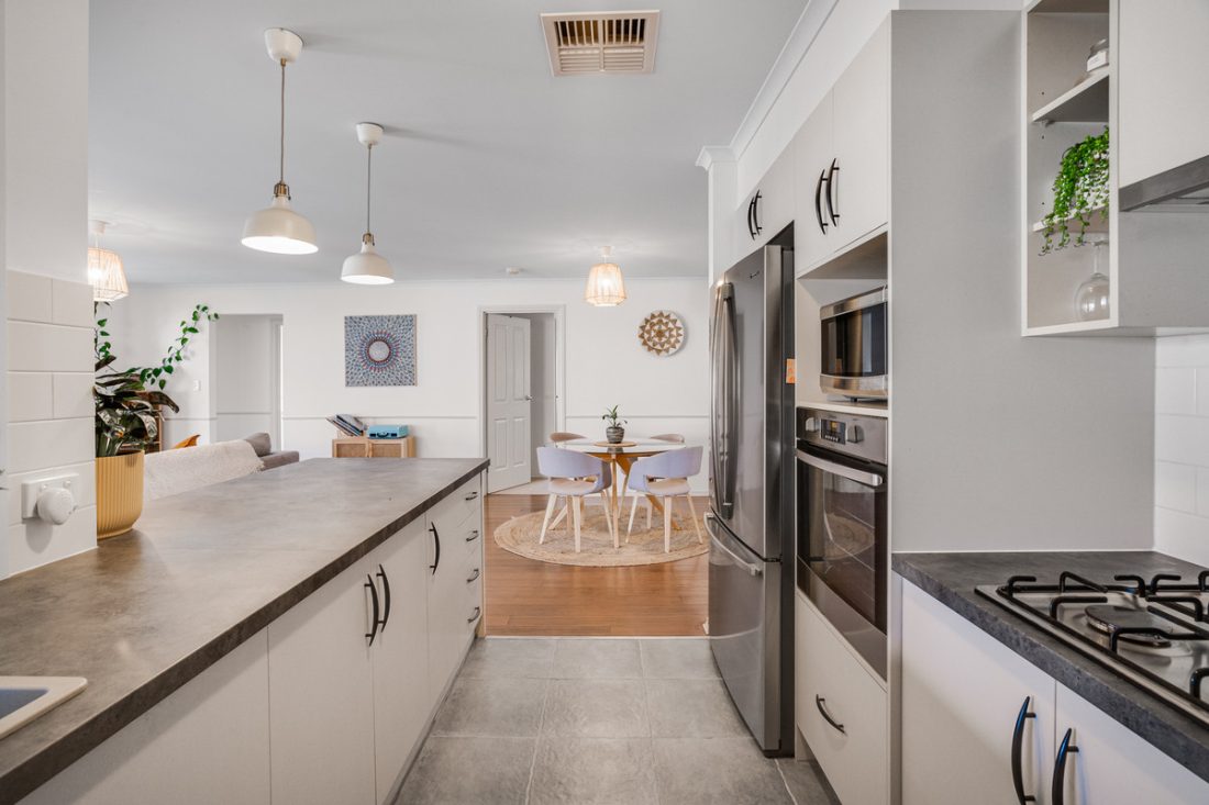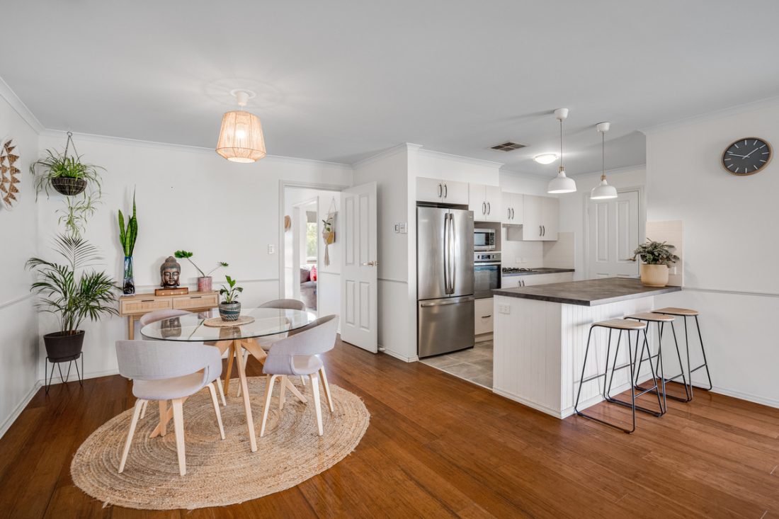 The large open plan living and dining area provides abundant space for relaxation and entertainment, with the continued timber floors and an abundance of natural light creating a warm and welcoming atmosphere. The seamless flow from indoor to outdoor living is effortless, as the concreted undercover outdoor area, complete with cafe blinds, allows for year-round enjoyment of family dinners and outdoor gatherings.