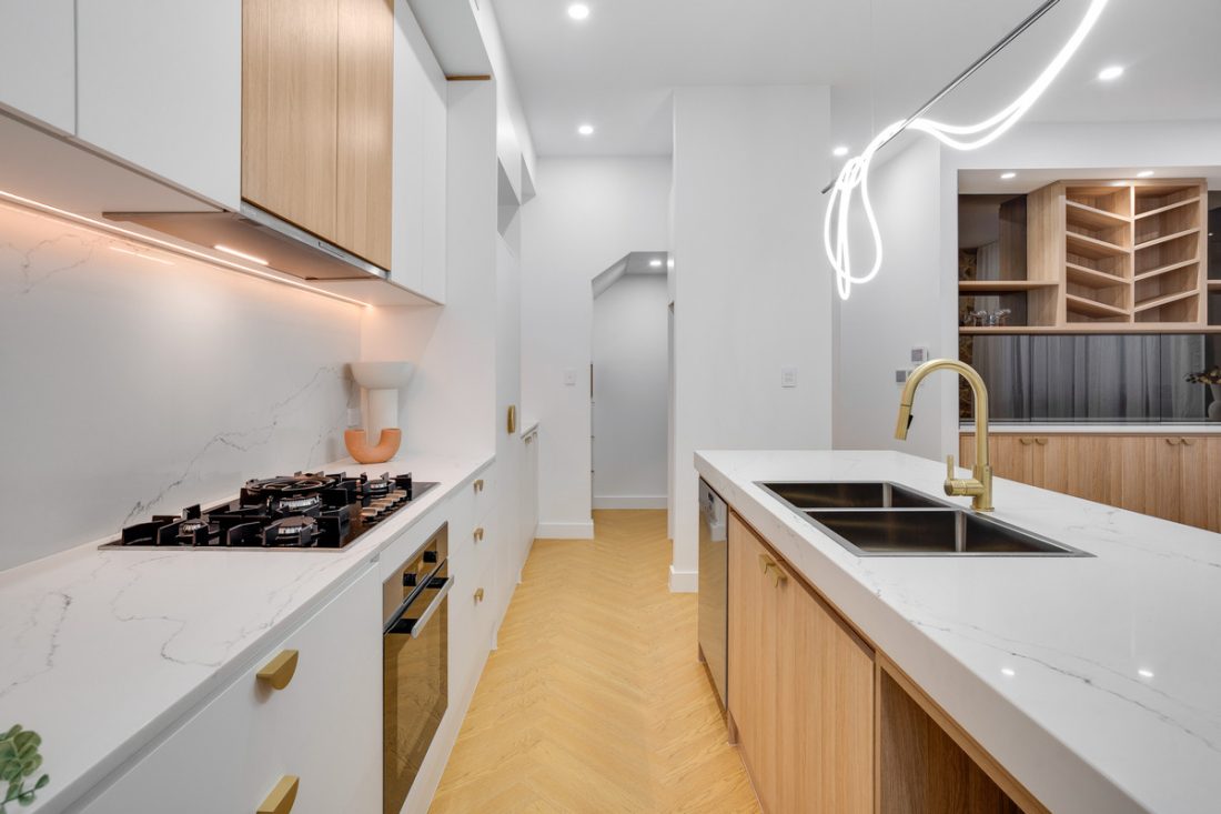 The hallway leads you to the heart of the home – an open-plan kitchen, dining, and living area, designed to perfection. The kitchen is a chef’s dream, featuring brushed brass tapware, stone benchtops and splashbacks, and an island bench with timber cladding. High-quality Miele appliances, including a 5-burner gas cooktop, oven, and dishwasher, ensure both functionality and style. The adjoining butler’s pantry offers additional storage and prep space, seamlessly integrating with the kitchen.