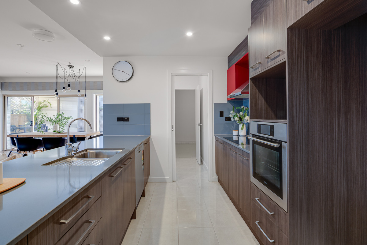 The open-plan living, dining, and kitchen area is an entertainer’s dream. The modern kitchen boasts stone benchtops, stainless-steel appliances, an induction cooktop, tiled splashback, and ample bench space. A large walk-in pantry, with convenient garage access, adds practicality to this stylish space.