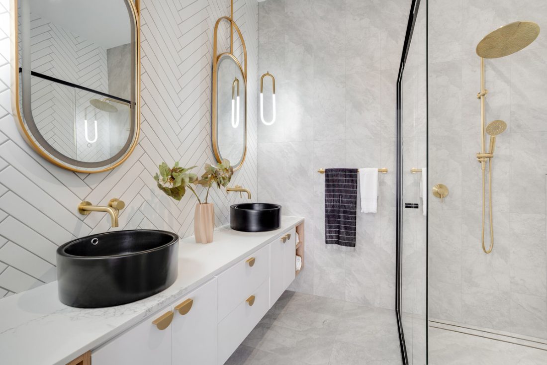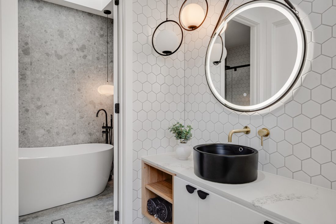 – Main bathroom with floor-to-ceiling tiles, brushed brass tapware, pendant lighting, and bathtub.