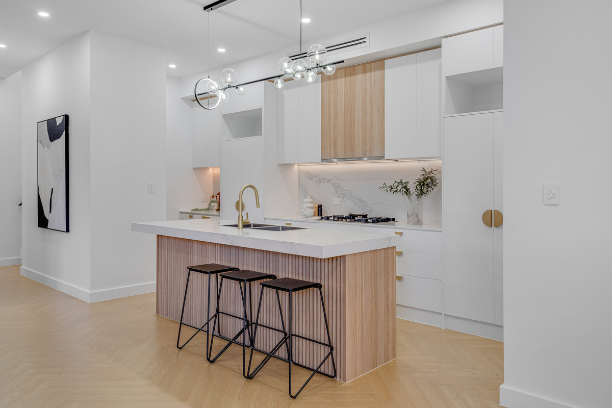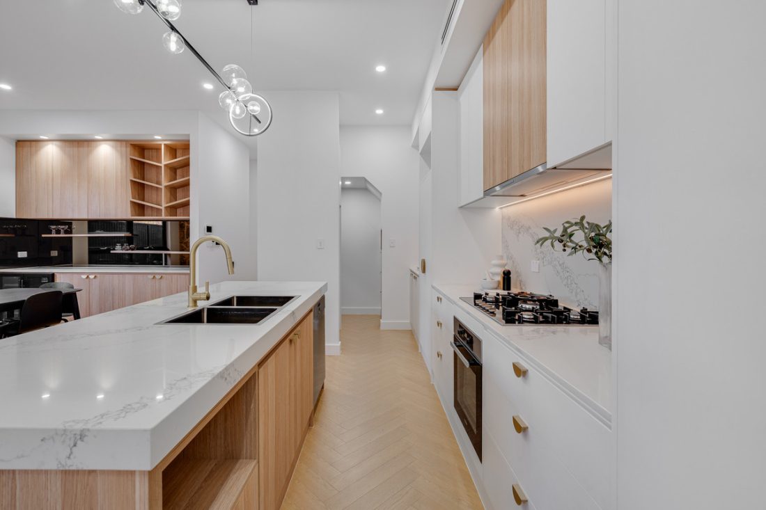 The hallway leads you to the heart of the home – an open-plan kitchen, dining, and living area, designed to perfection. The kitchen is a chef’s dream, featuring brushed brass tapware, stone benchtops and splashbacks, and an island bench with timber cladding. Quality Miele appliances, including a 5-burner gas cooktop, oven, and dishwasher, ensure both functionality and style. The adjoining butler’s pantry offers additional storage and prep space, seamlessly integrating with the kitchen.
