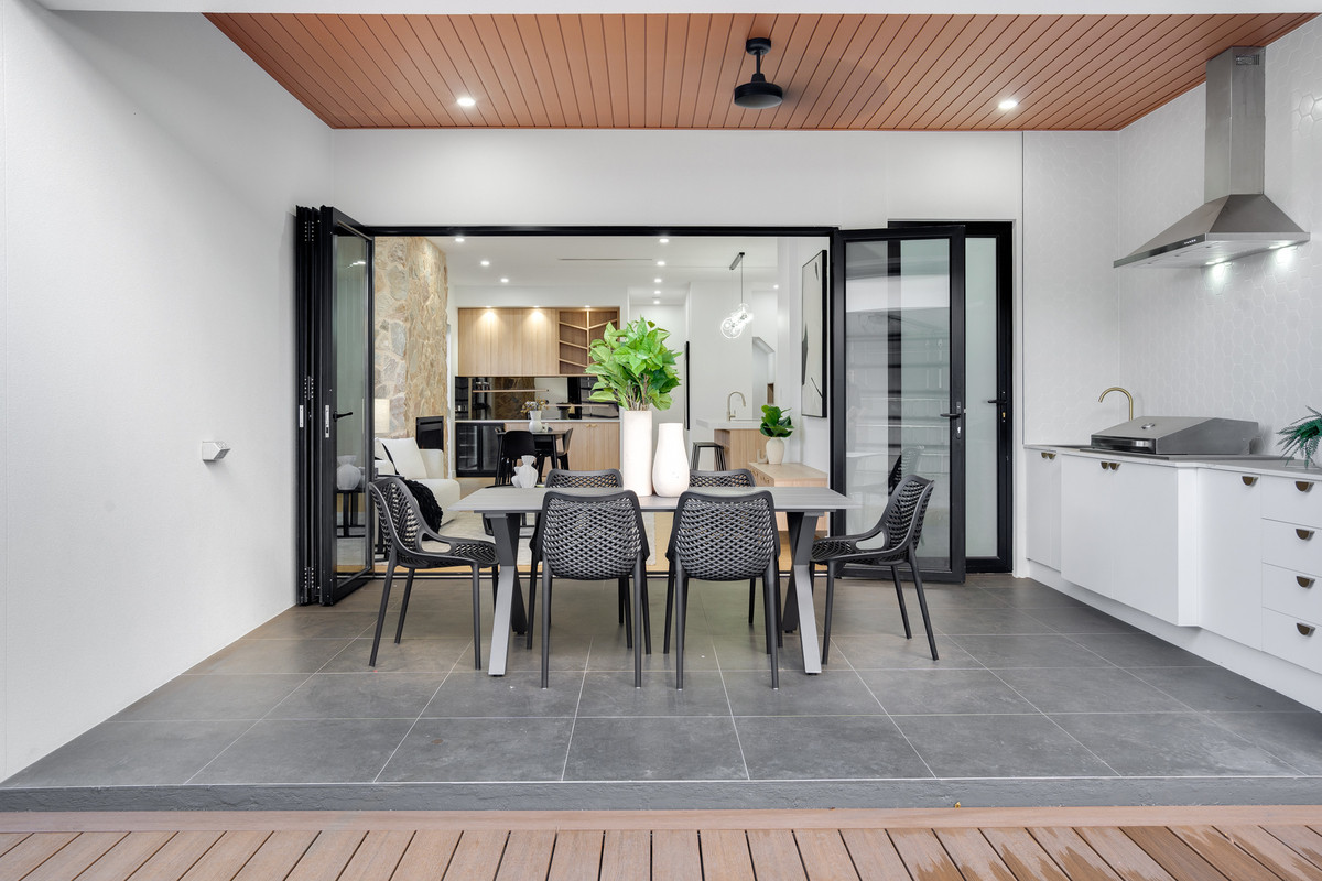 – Glass sliding doors lead to an undercover alfresco area with ceiling fan, BBQ, and sink, overlooking a decked area