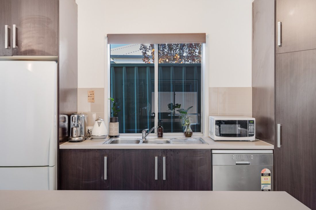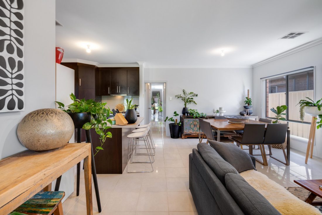 The modern, bricked facade sets the tone as you step inside, where a hallway leads you into the heart of the home. Here, the open-plan kitchen, living, and dining areas combine into a spacious and welcoming hub. The kitchen features stylish dark cabinetry, ample storage, a tiled backsplash, breakfast bar and sleek stainless steel appliances, including a gas cooktop.