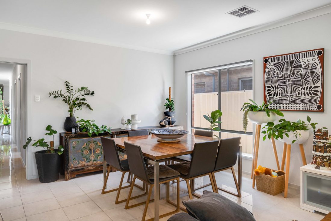 The adjoining dining and living areas are bathed in natural light, creating a bright and airy atmosphere. Glass sliding doors open to the outdoor space, seamlessly blending indoor and outdoor living. The large backyard, complete with a charming undercover alfresco area, overlooks a generous stretch of lawn, the perfect space for relaxing outdoors.