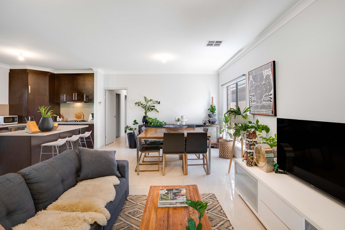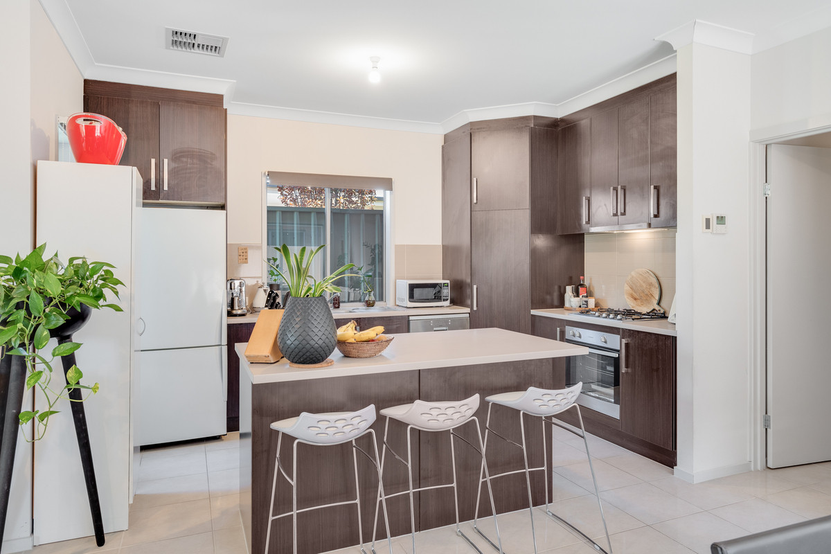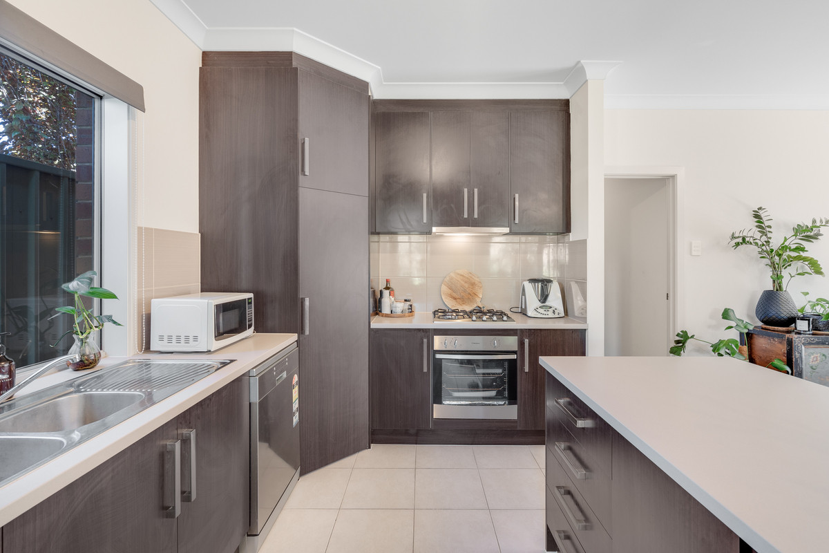 The modern, bricked facade sets the tone as you step inside, where a hallway leads you into the heart of the home. Here, the open-plan kitchen, living, and dining areas combine into a spacious and welcoming hub. The kitchen features stylish dark cabinetry, ample storage, a tiled backsplash, breakfast bar and sleek stainless steel appliances, including a gas cooktop.