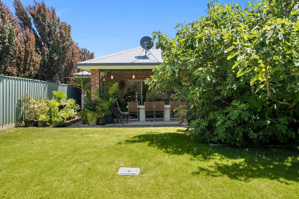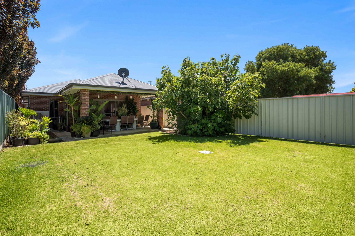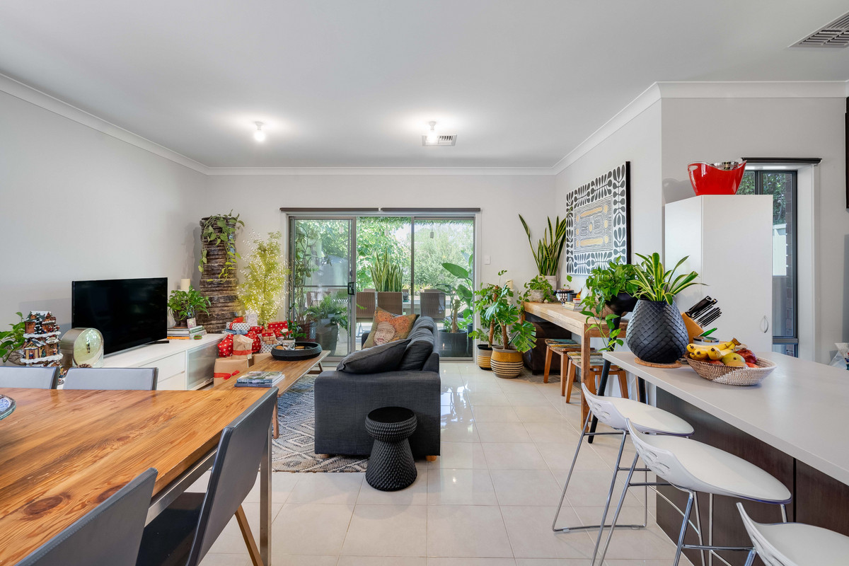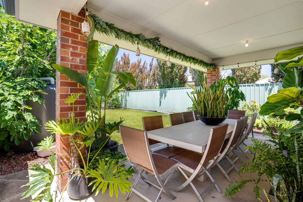 The adjoining dining and living areas are bathed in natural light, creating a bright and airy atmosphere. Glass sliding doors open to the outdoor space, seamlessly blending indoor and outdoor living. The large backyard, complete with a charming undercover alfresco area, overlooks a generous stretch of lawn, the perfect space for relaxing outdoors.