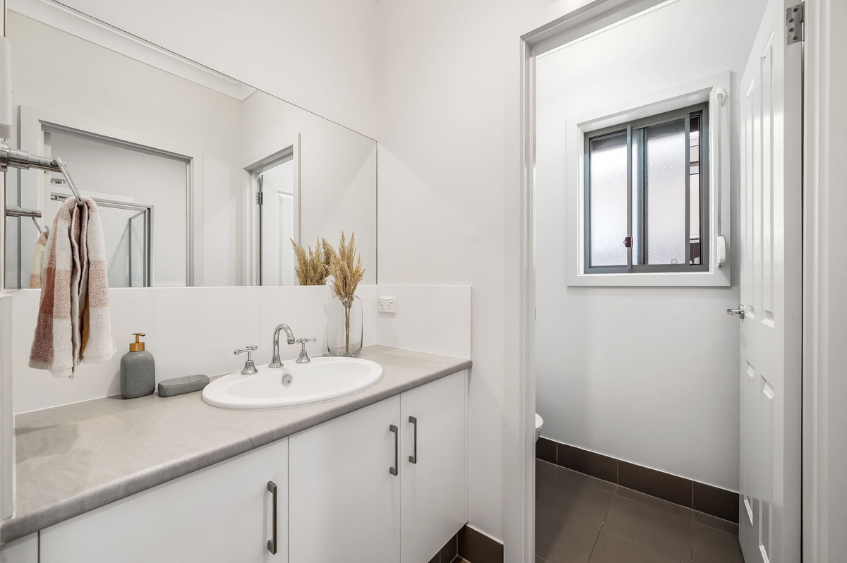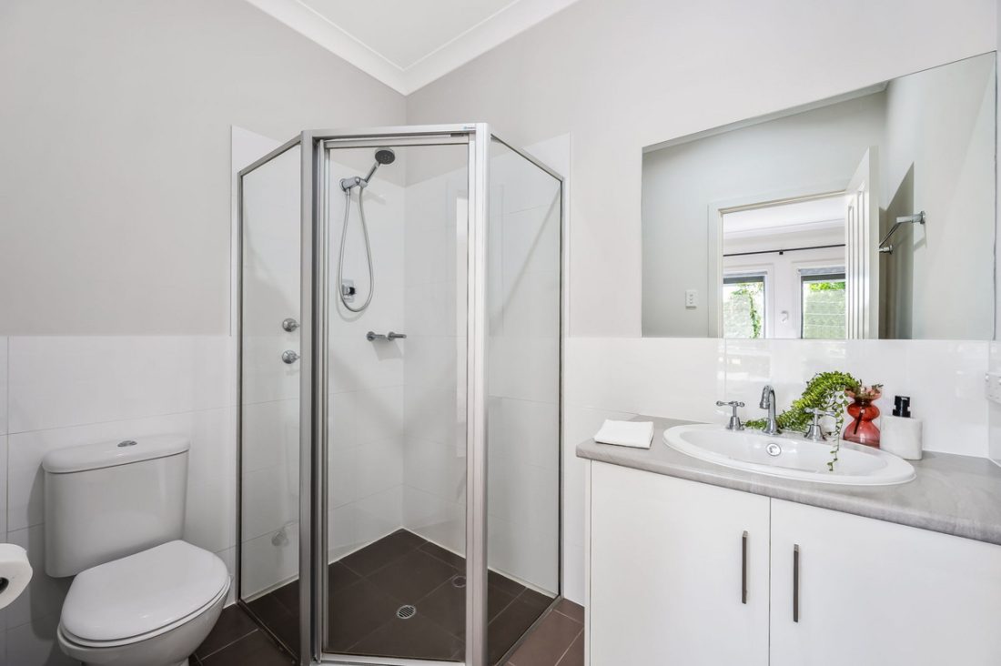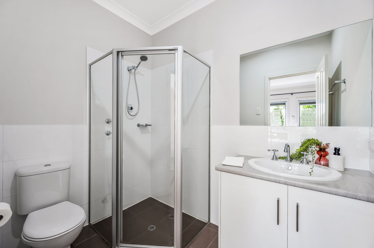 The ensuite and main bathroom share a cohesive design, complete with large vanities, white tiling, and contemporary fixtures. The main bathroom’s three-way layout adds extra convenience, featuring a built-in bath and a separate toilet.