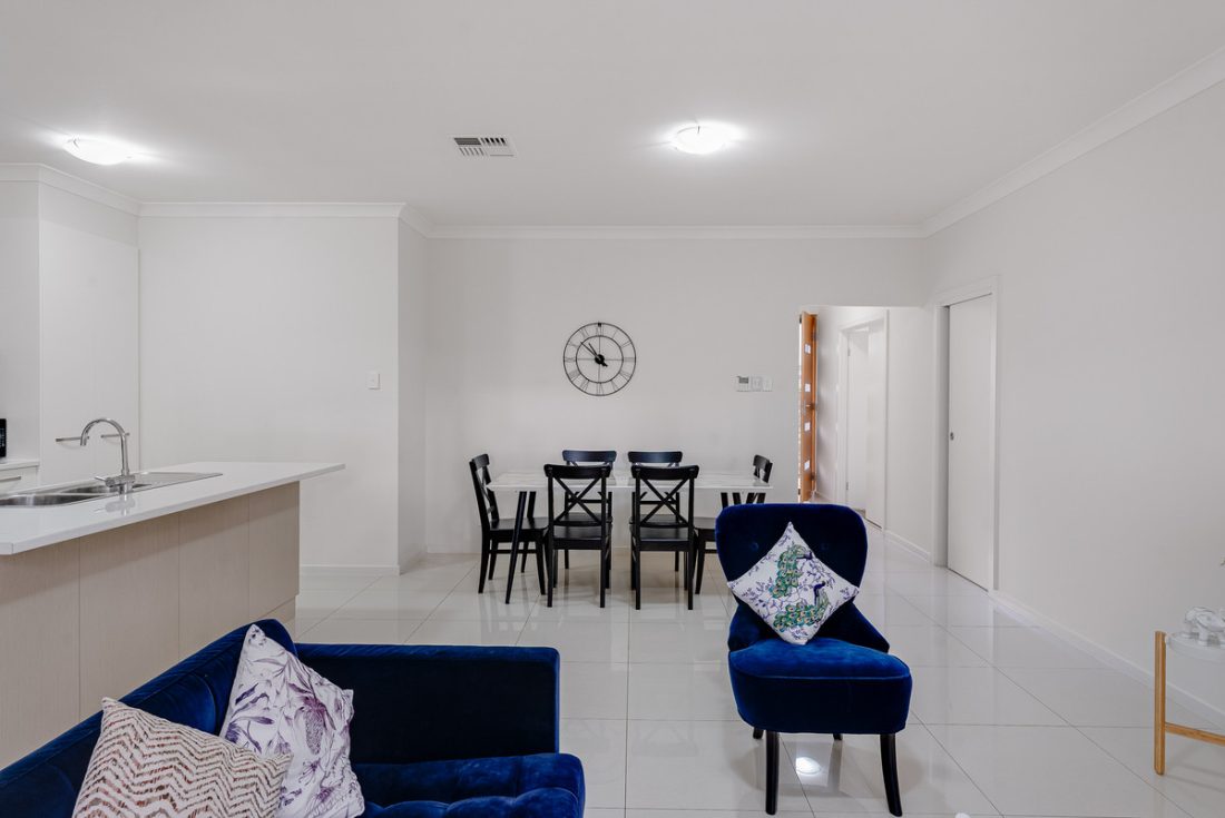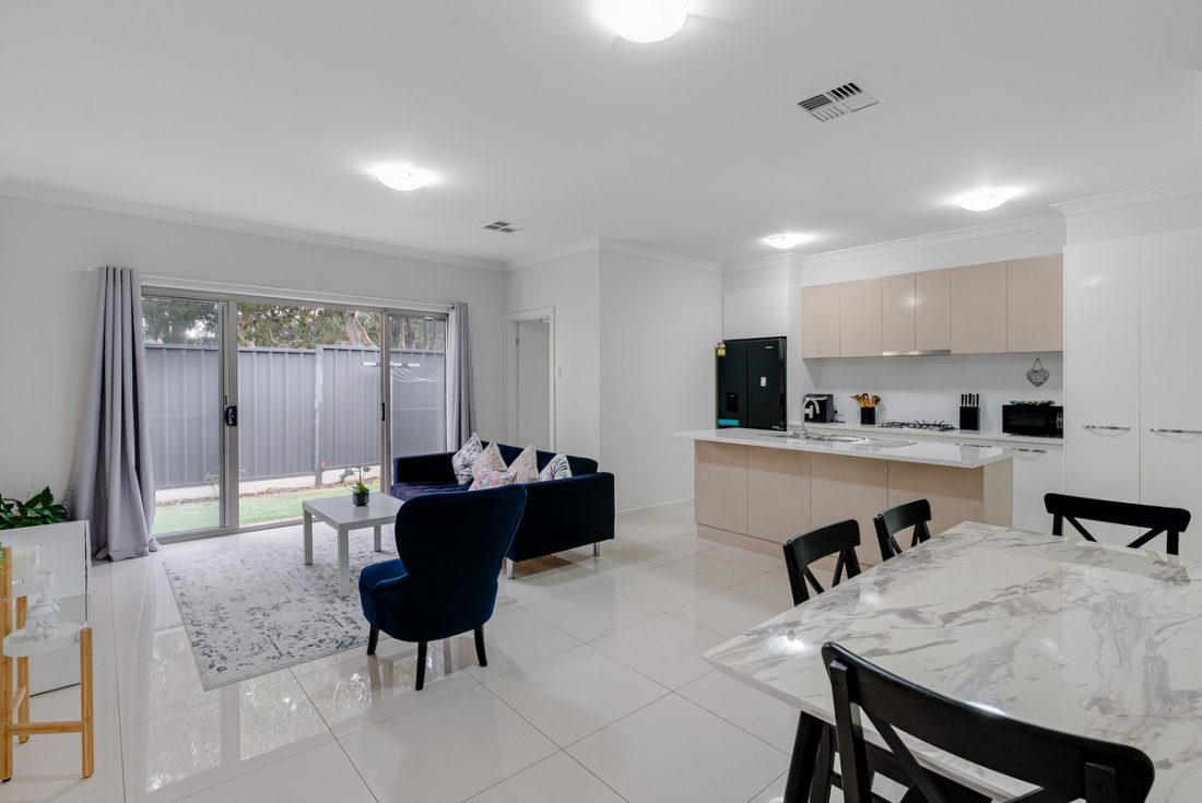 As you approach the home, a neat and sleek facade welcomes you in. Step inside and follow the hallway to the heart of the home, where the open-plan kitchen, living, and dining areas combine to form a warm and inviting space. The pristine kitchen boasts stylish two toned cabinetry, large island with breakfast bar, and sleek stainless stainless steel appliances including a gas cook-top.