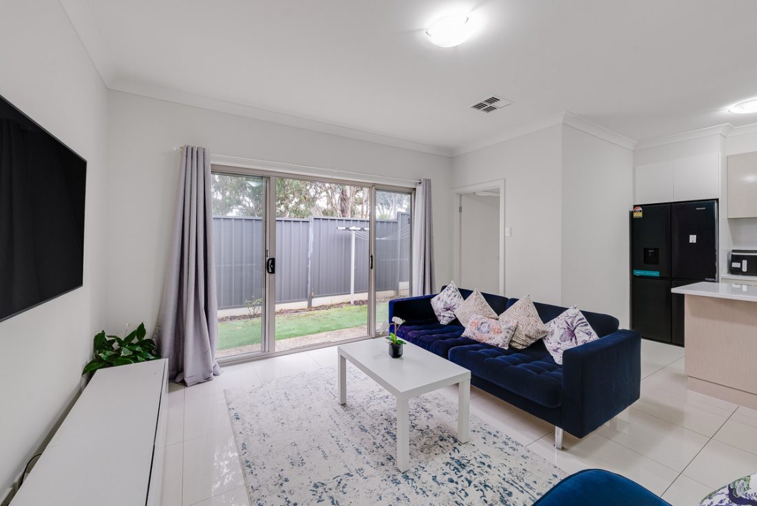 Glass sliding doors seamlessly connect the indoor and outdoor spaces, leading to a neat and low-maintenance space complete with artificial turf, the perfect spot to soak in the sunshine without the hassle of upkeep.