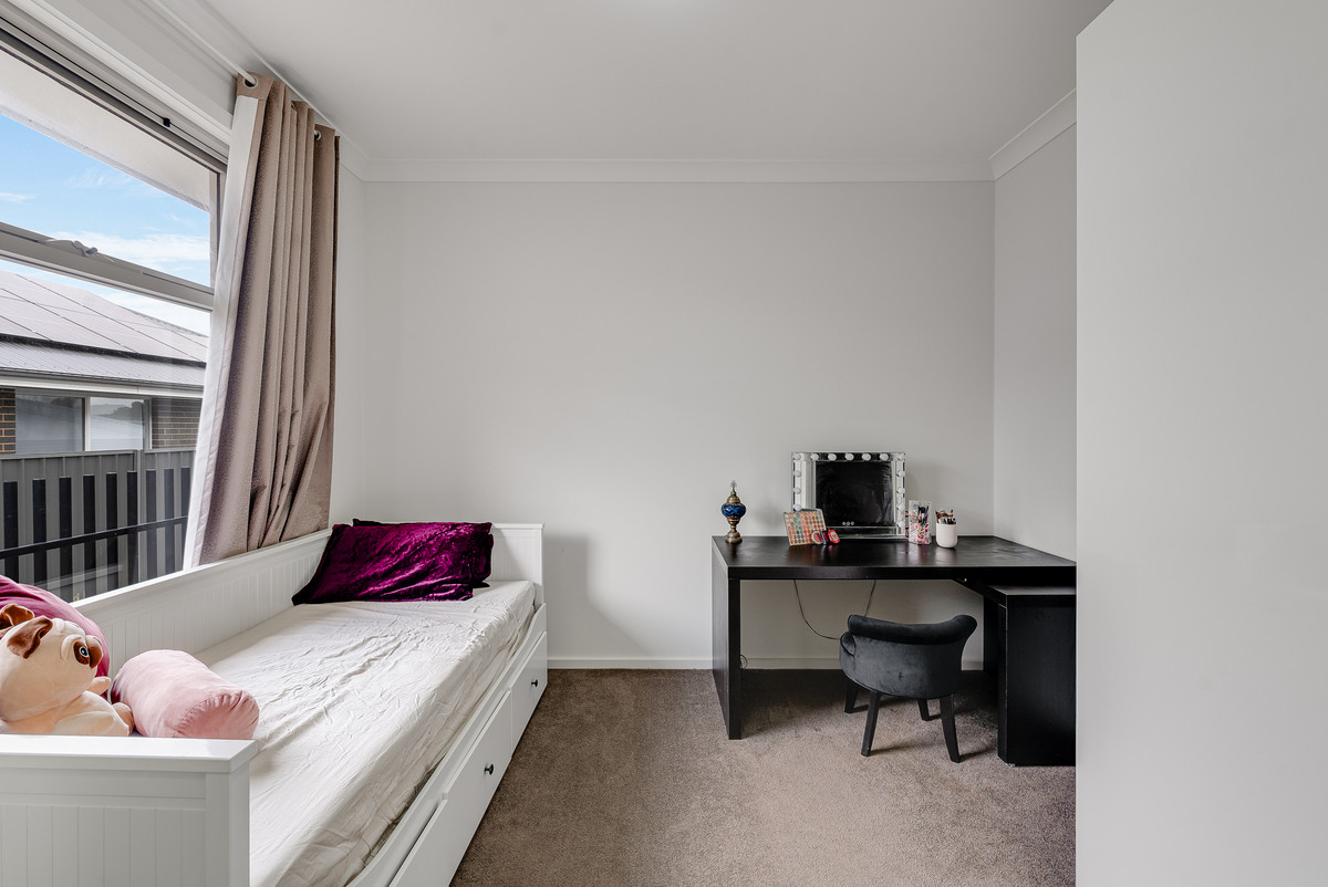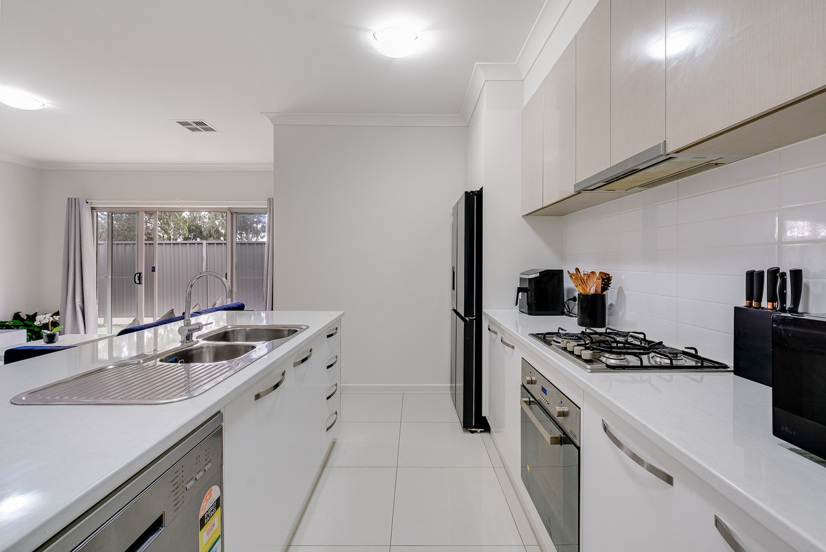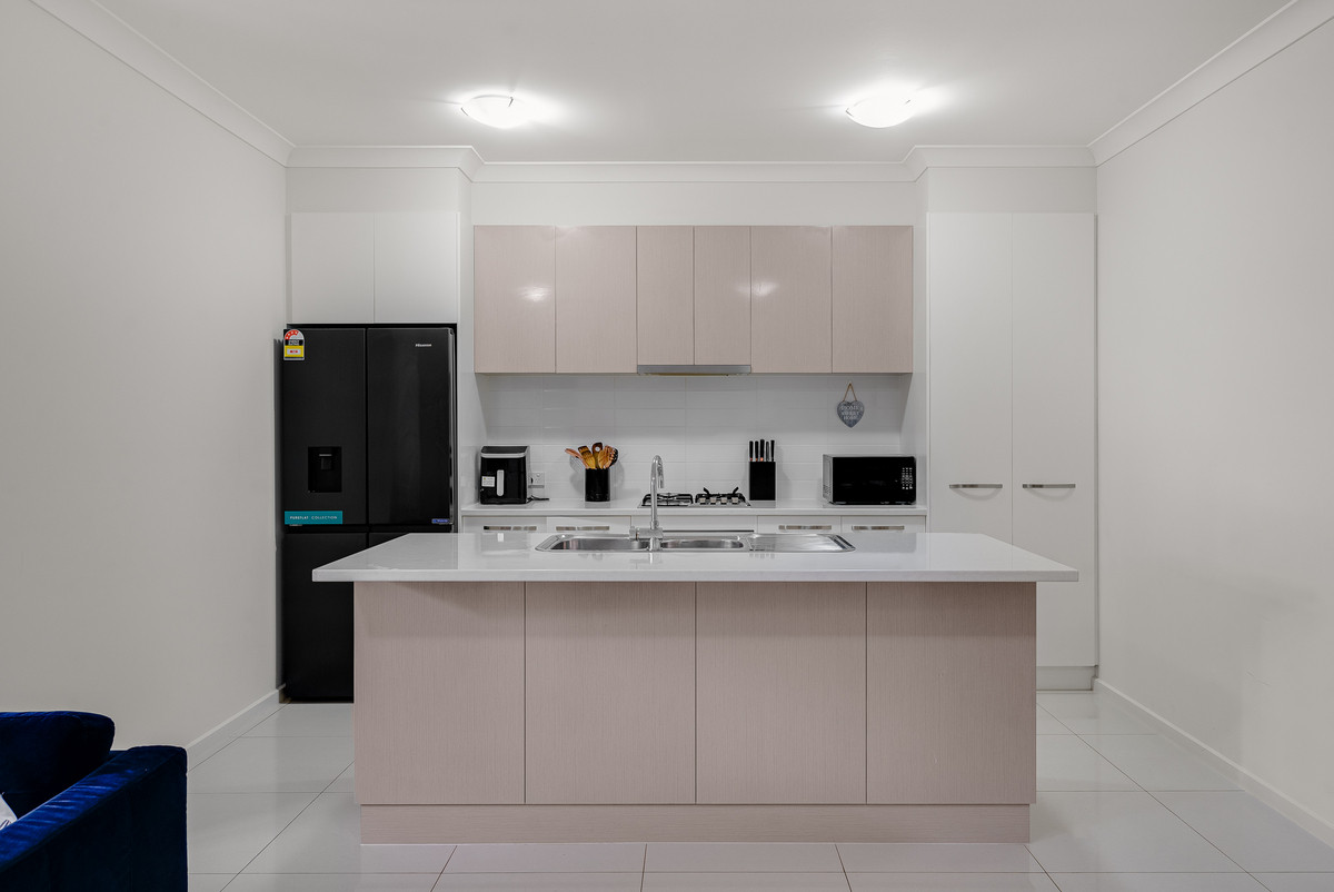As you approach the home, a neat and sleek facade welcomes you in. Step inside and follow the hallway to the heart of the home, where the open-plan kitchen, living, and dining areas combine to form a warm and inviting space. The pristine kitchen boasts stylish two toned cabinetry, large island with breakfast bar, and sleek stainless stainless steel appliances including a gas cook-top.