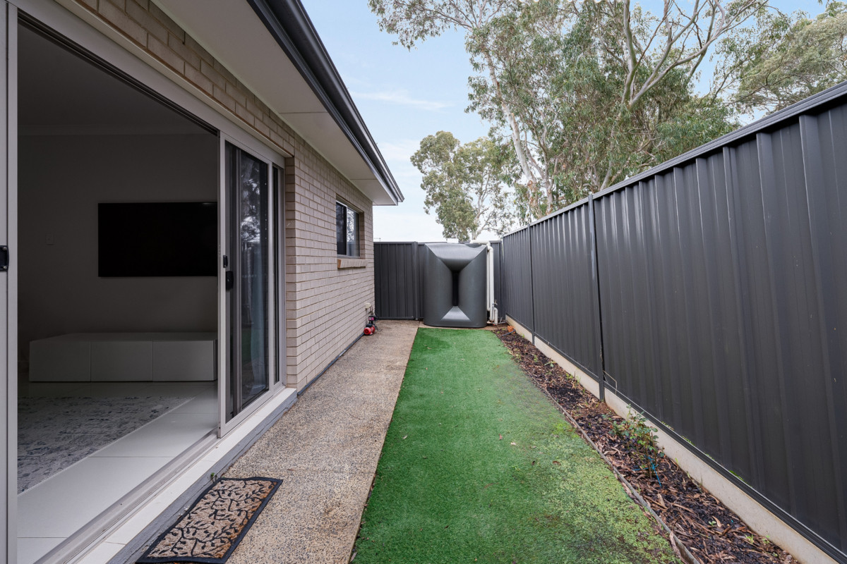 Glass sliding doors seamlessly connect the indoor and outdoor spaces, leading to a neat and low-maintenance space complete with artificial turf, the perfect spot to soak in the sunshine without the hassle of upkeep.