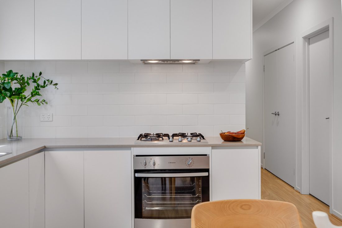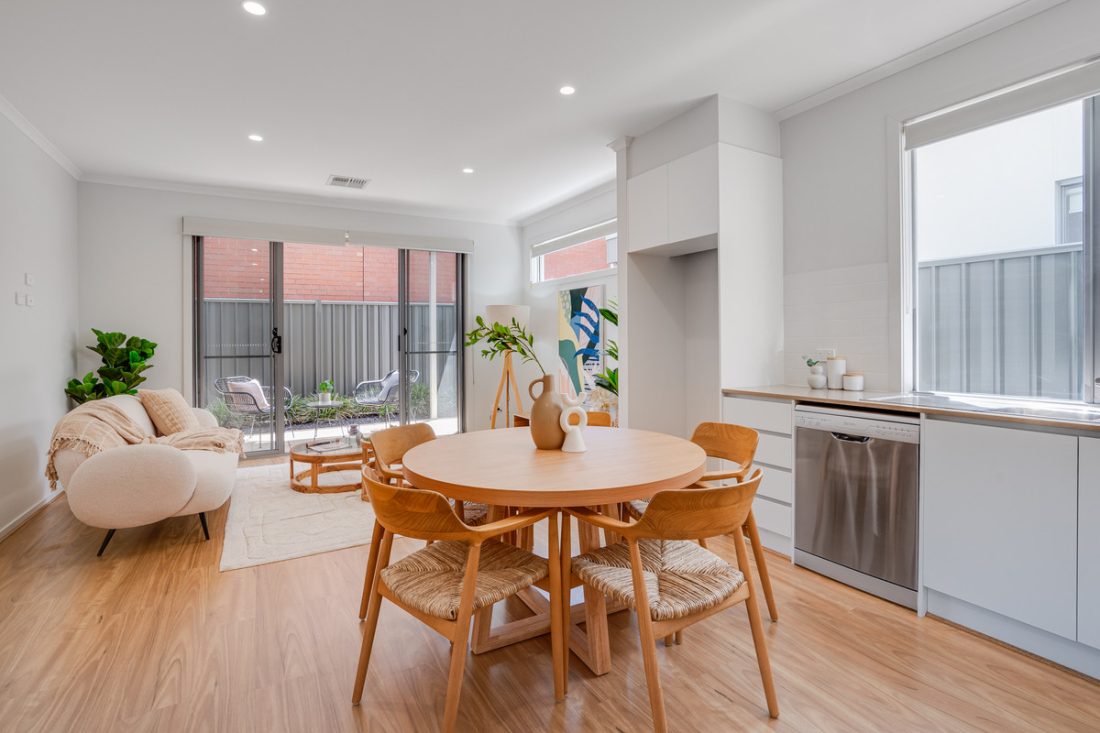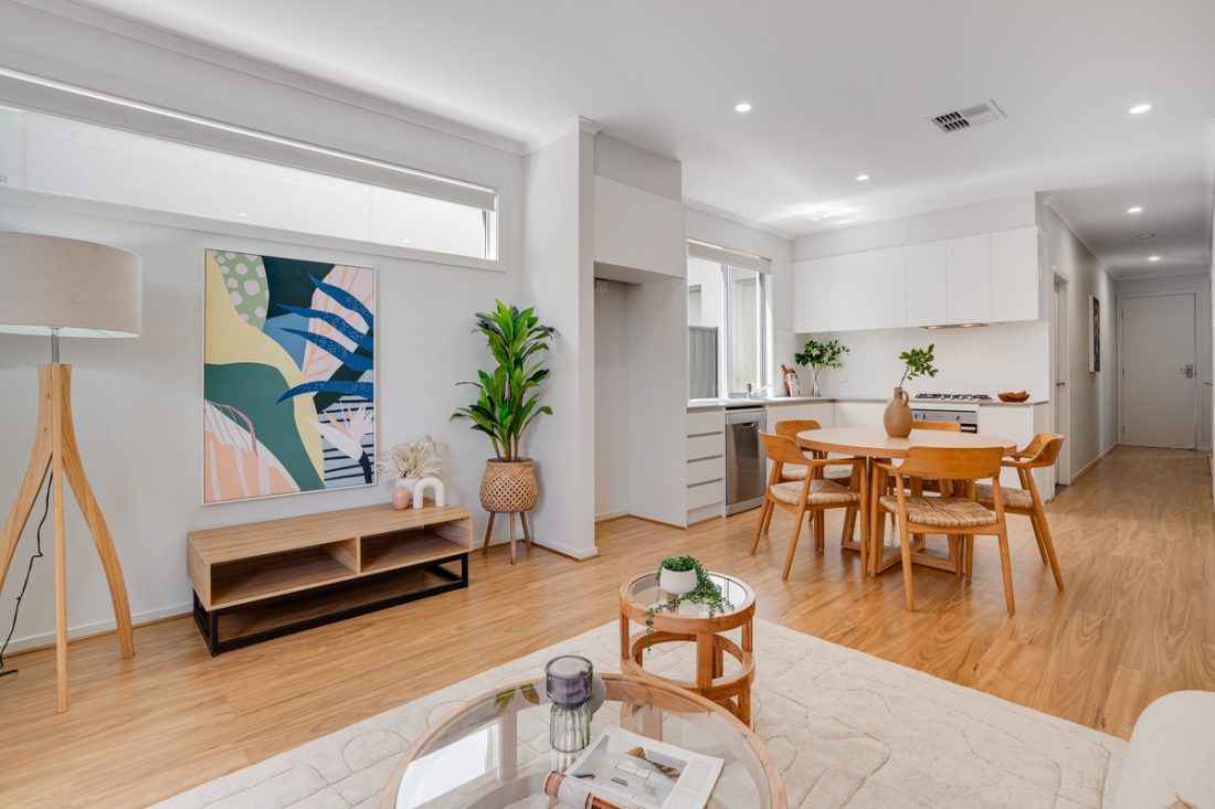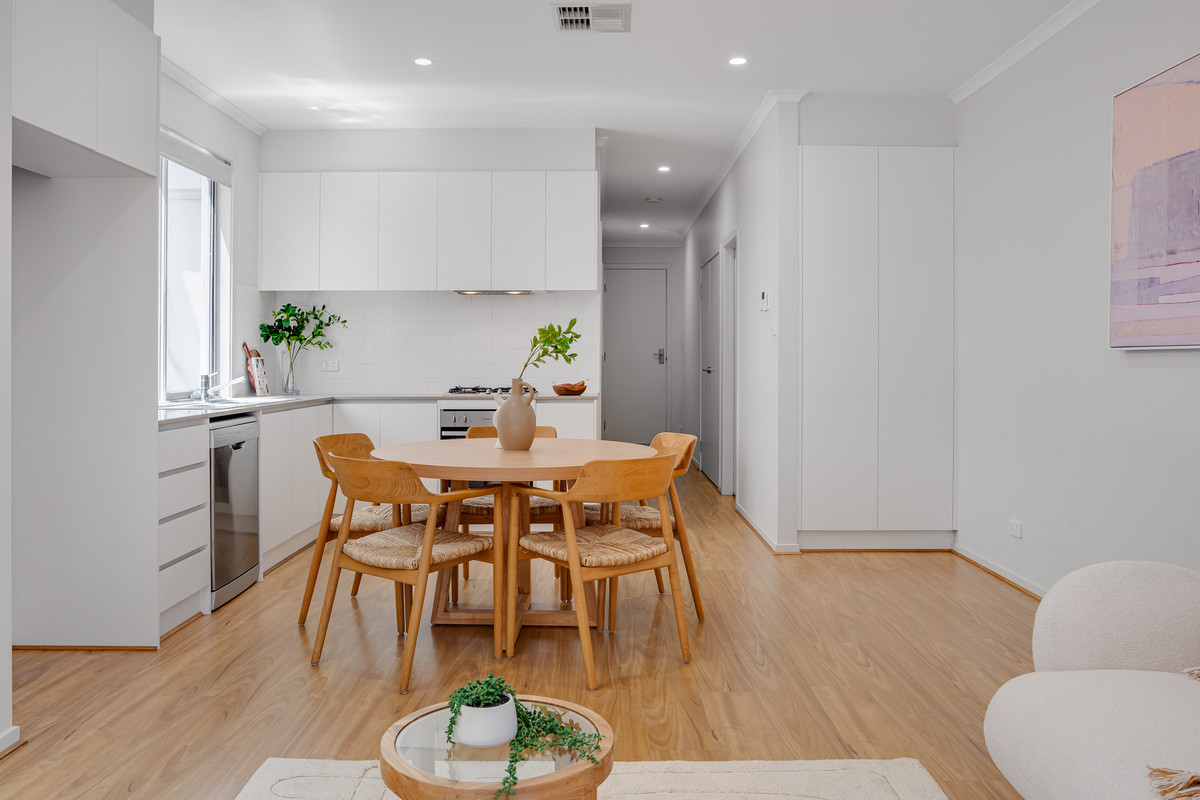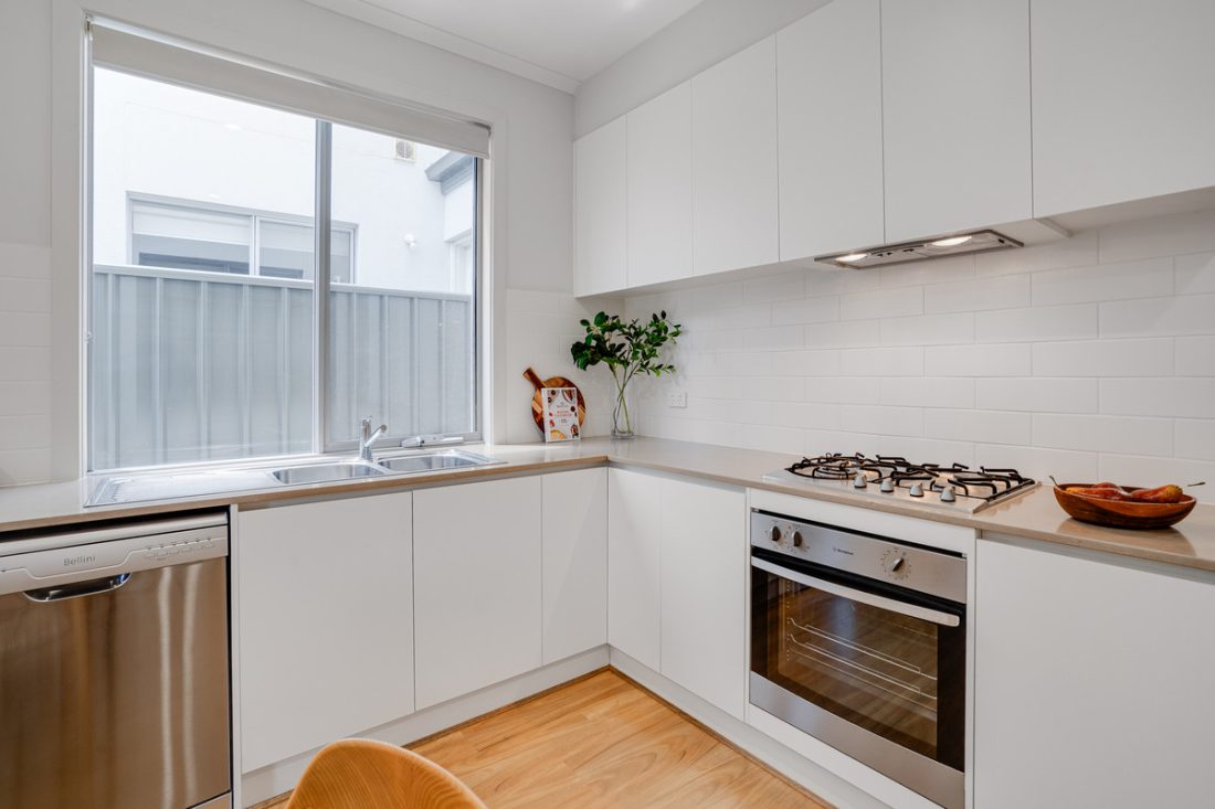 Step inside and follow the hallway into the heart of the home – a stylish open-plan kitchen, dining, and living area destined to be the central hub of everyday living. Bathed in natural sunlight, the modern kitchen boasts sleek handleless cabinets, subway tiled backsplash and stainless-steel appliances including a gas cooktop.