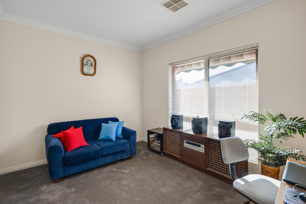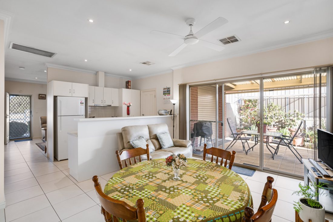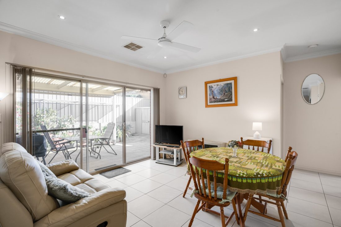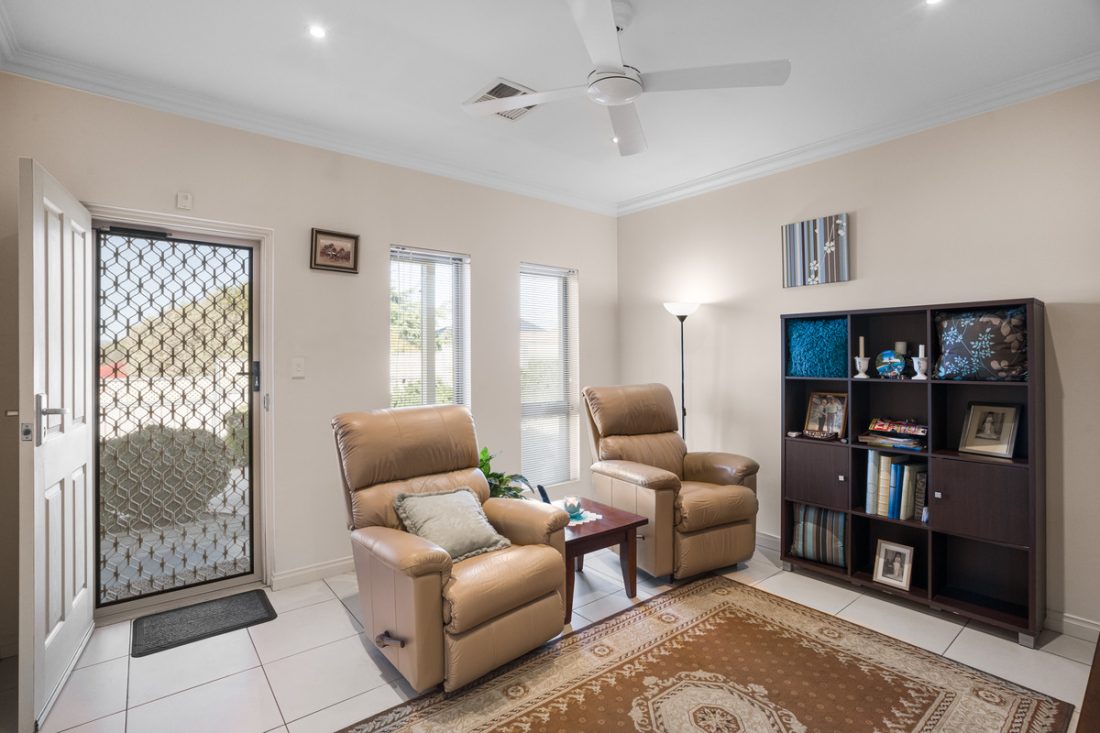 As you arrive, you’ll be greeted by a charming exterior, cladded with stone and complete with a tidy garden bed. Step inside to be welcomed by the front living room, bathed in natural sunlight from two generous windows and equipped with a ceiling fan for year-round comfort.