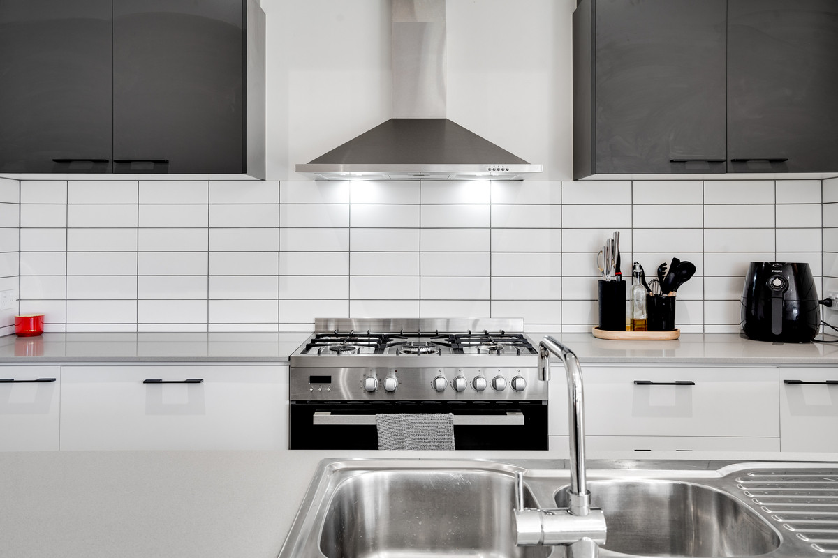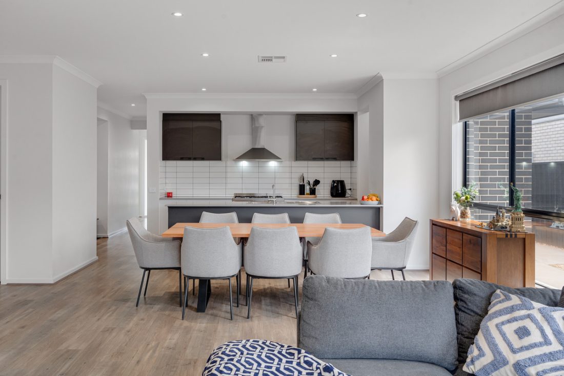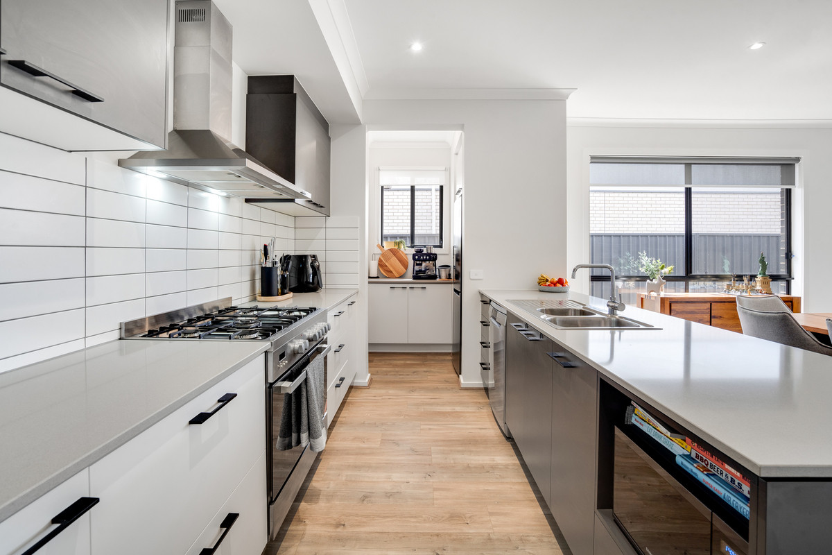 Inside, follow the hallway that guides you to the heart of this residence, where the open-plan kitchen, living, and dining areas combine to form an open and welcoming space. The pristine kitchen features stylish two-toned cabinetry, a walk-in butlers pantry, breakfast bar with room for bar seating, tiled backsplash and stainless steel appliances including a gas cook-top.