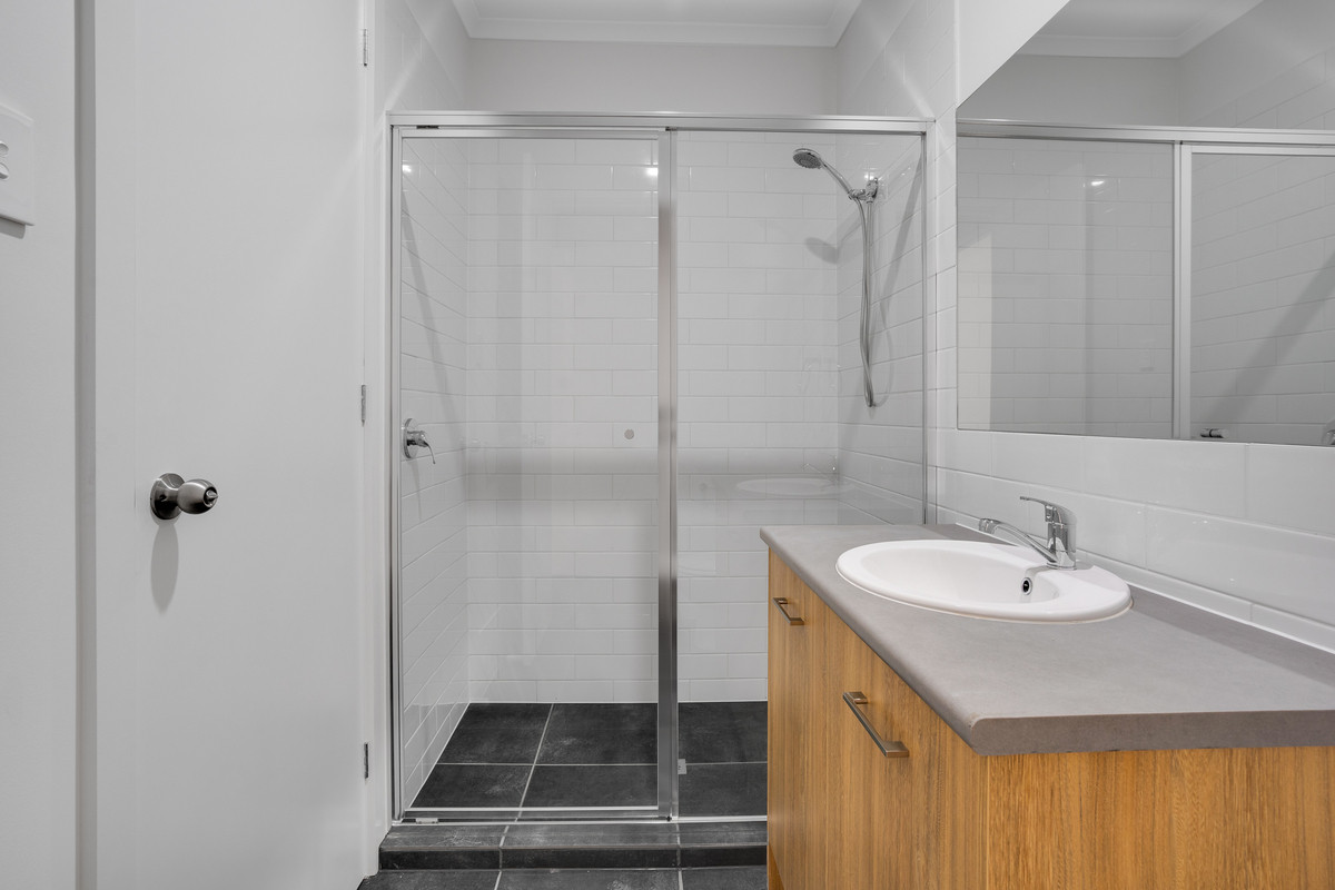 Back down the hallway, discover three good-sized bedrooms, each with ceiling fans, built-in wardrobes and plenty of natural light. The bathroom reflects the home’s stylish aesthetics with chic subway tiles, a wooden vanity, and a spacious shower.