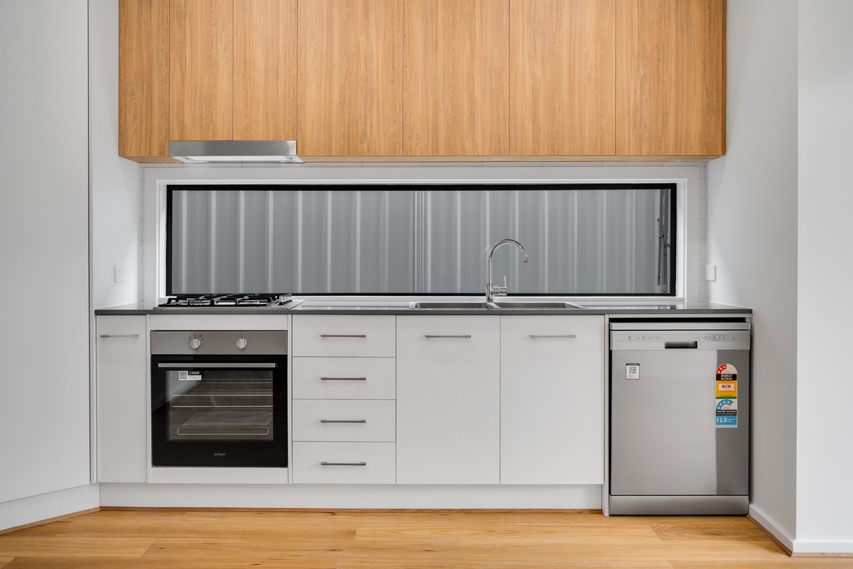 Inside, the open-plan kitchen and living area form the heart of the home, creating a spacious and inviting setting for both everyday activities and social gatherings. The kitchen features sleek, stylish aesthetics with a glass splash-back and stainless steel appliances, including a gas cooktop and dishwasher.