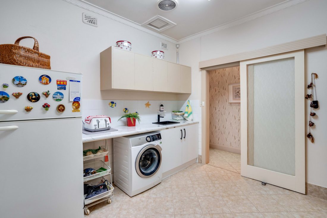 The main bathroom is stylish and functional, complete with floor-to-ceiling tiles, a built-in bathtub, a modern vanity, and a separate toilet. A spacious laundry with modern built-in cabinetry adds to the home’s practicality.
