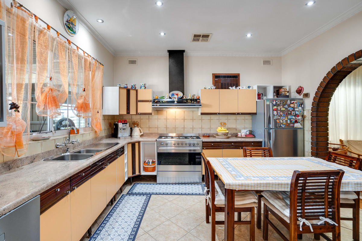 At the heart of the home, the kitchen is both functional and full of character, boasting ample cabinetry, a tiled backsplash, and modern stainless steel appliances, including a freestanding Smeg oven with a gas cooktop and a dishwasher. With plenty of space for a dining table, it’s the perfect spot to gather and enjoy meals with family.