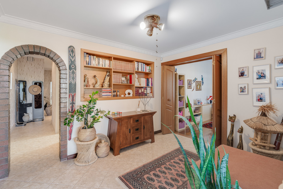 Step inside to an impressive wide entrance, hinting at the generous proportions throughout. The front lounge is a cozy retreat, featuring rich wooden flooring, warm wood wall paneling, and charming glass sliding doors that open to the formal dining space or a secondary living area. The character continues with a striking brick archway that frames the kitchen, adding to the home’s unique appeal.