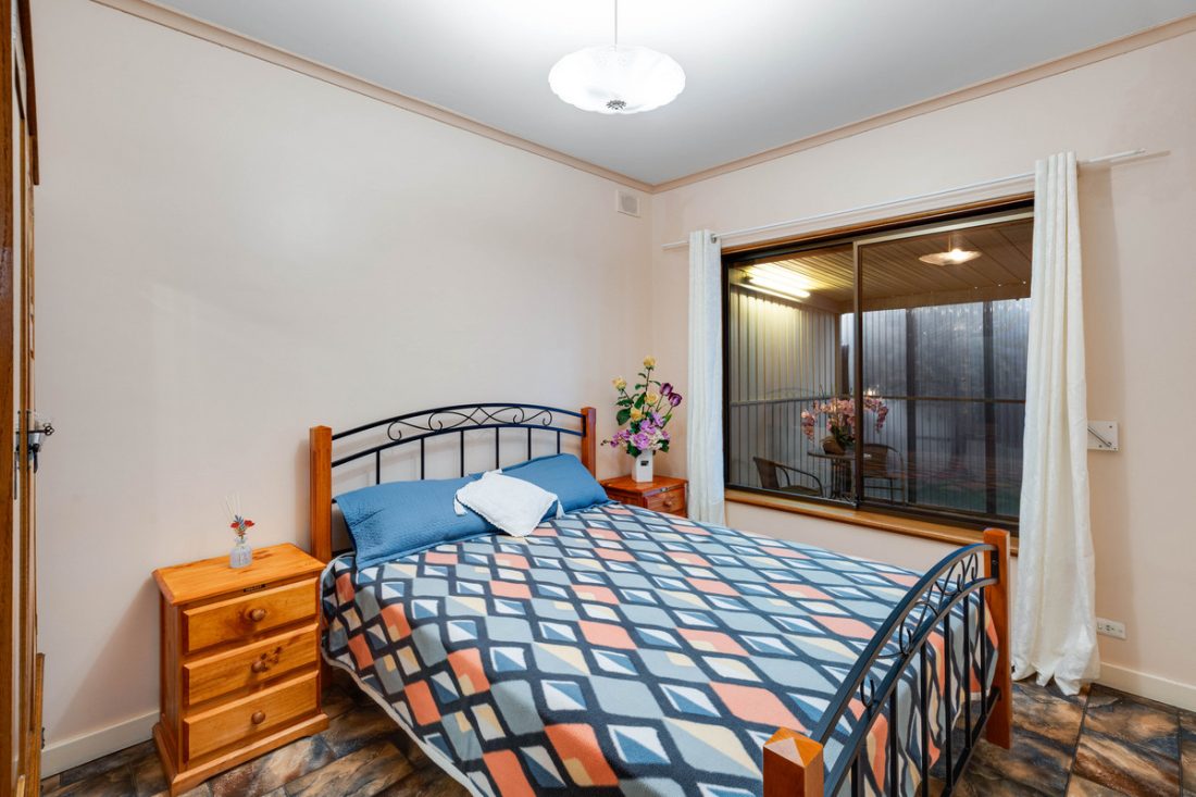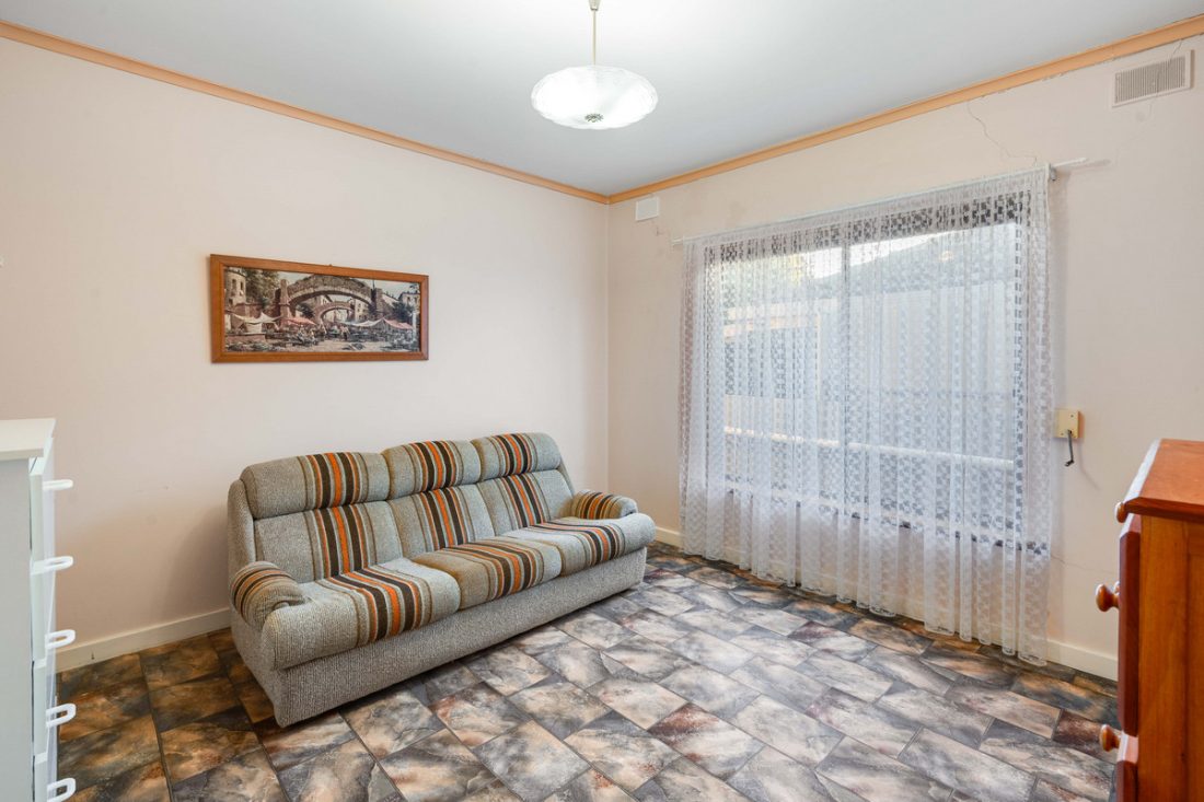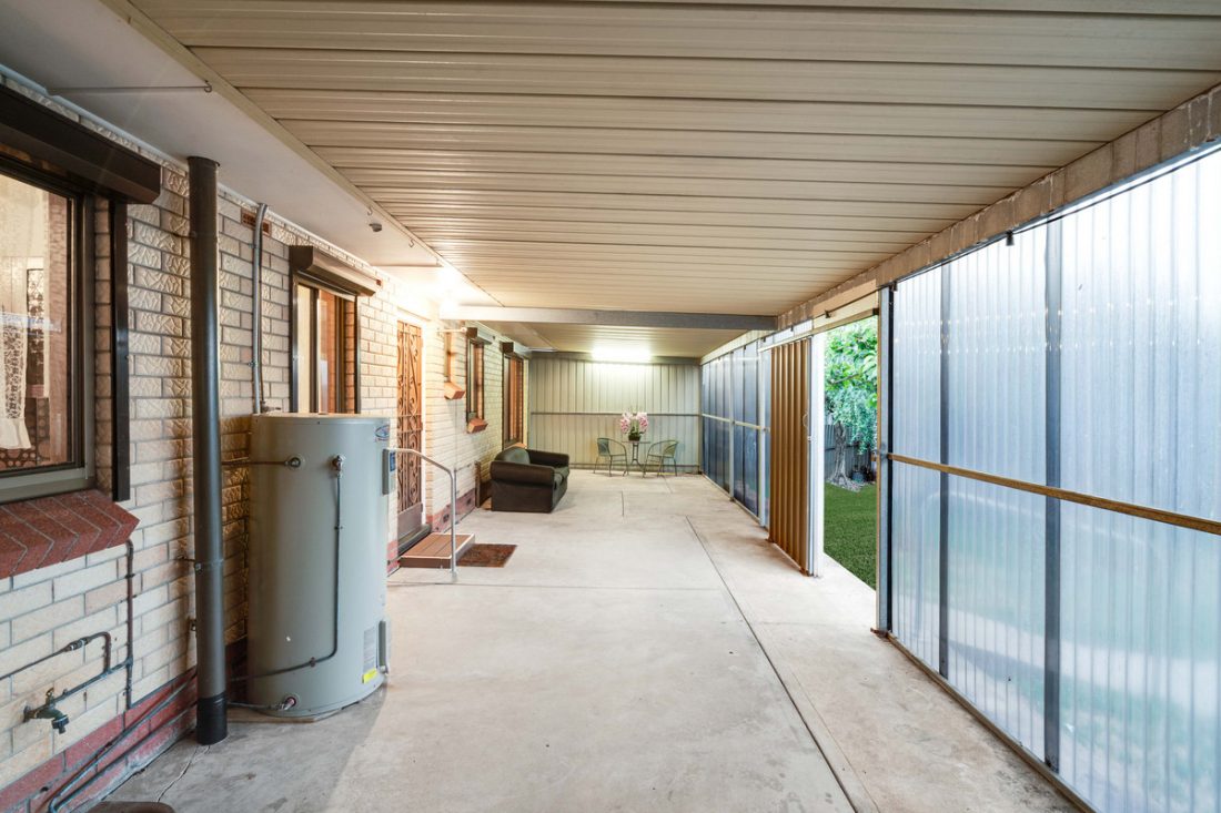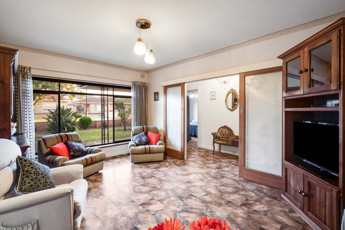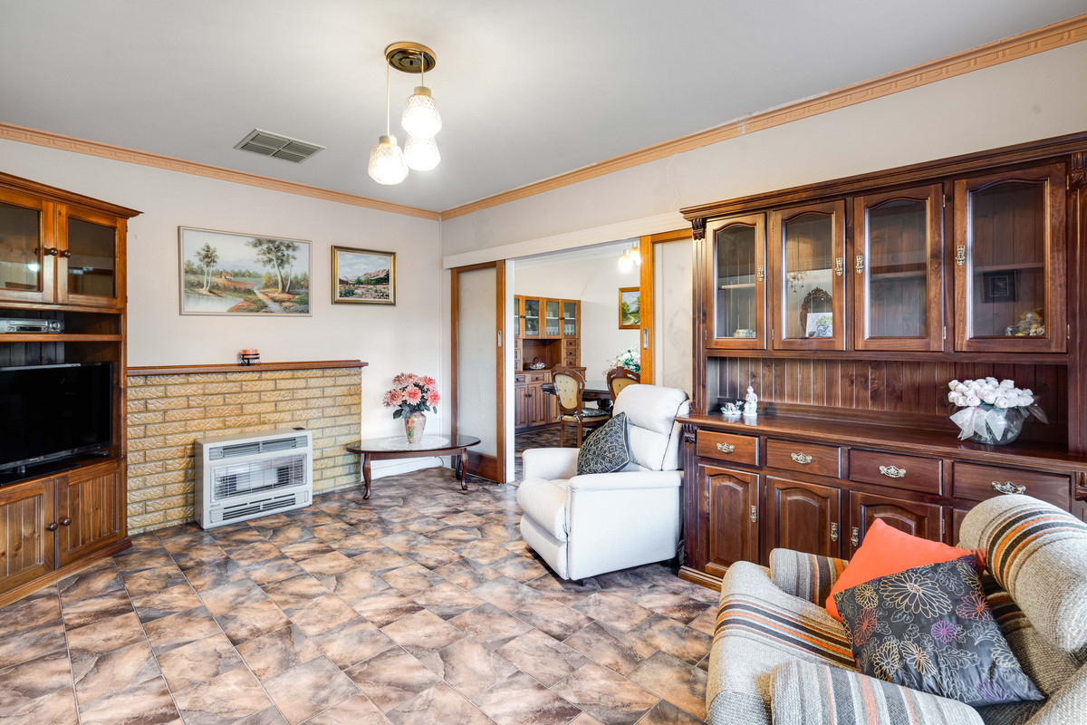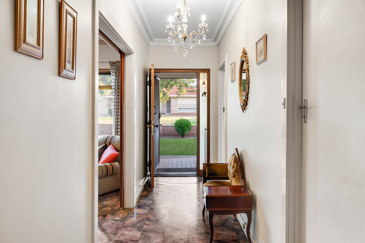 Original vinyl floors greet you at the front door, guiding you through light-filled interiors where a statement chandelier draws your eye down the hallway. At the front of the home, a spacious living room enjoys a large picture window, glass sliding doors and a classic mantlepiece complete with gas heater, creating a warm and inviting space to unwind. Roller shutters enhance both privacy and security, while evaporative air-conditioning and an additional wall-mounted air-conditioning unit ensure comfort across the seasons.