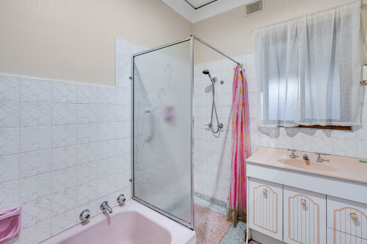 Three well-proportioned bedrooms provide comfortable accommodation, with the main positioned at the front of the home, enjoying a large window that draws in an abundance of natural light along. The remaining bedrooms are generous in scale and serviced by a main bathroom that proudly showcases its original terrazzo flooring, alongside a bathtub, shower and vanity. A separate toilet adds everyday convenience, while a functional laundry with additional storage and sink completes the internal footprint.