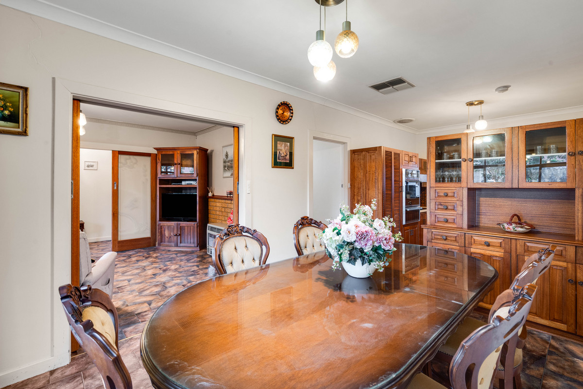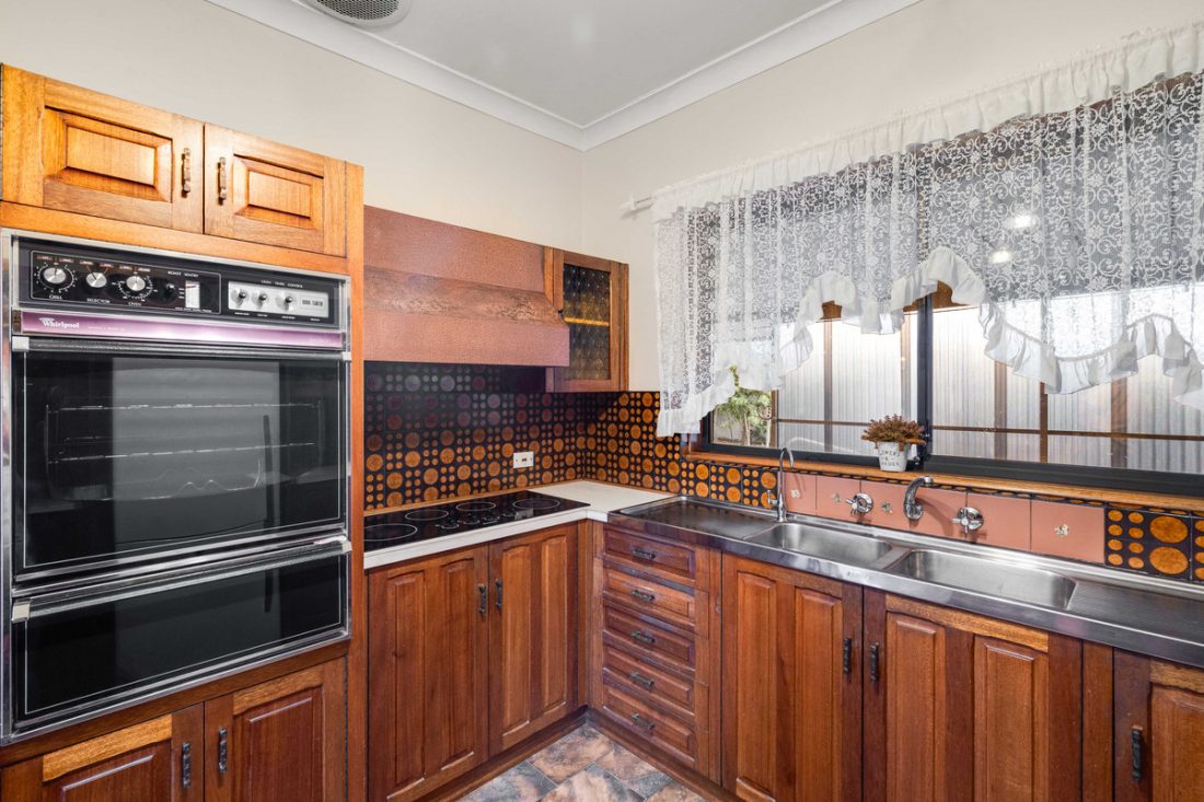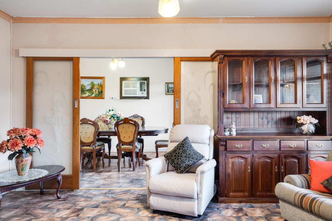 A further set of sliding doors continues the flow through to the dining room, positioned adjacent to the kitchen and ideal for both everyday meals and hosting. In the kitchen, the home’s original character remains beautifully intact, with dark walnut cabinetry paired with a tiled backsplash. A generous stainless steel double sink, cooktop and large conventional oven deliver practicality within a retro-inspired setting.