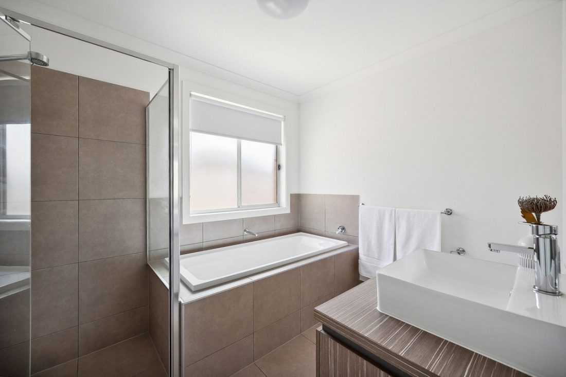 Both bathrooms are fresh and inviting, mirroring the same sleek fixtures for a cohesive look throughout the home, with the main bathroom featuring a built-in bath for a soothing soak.