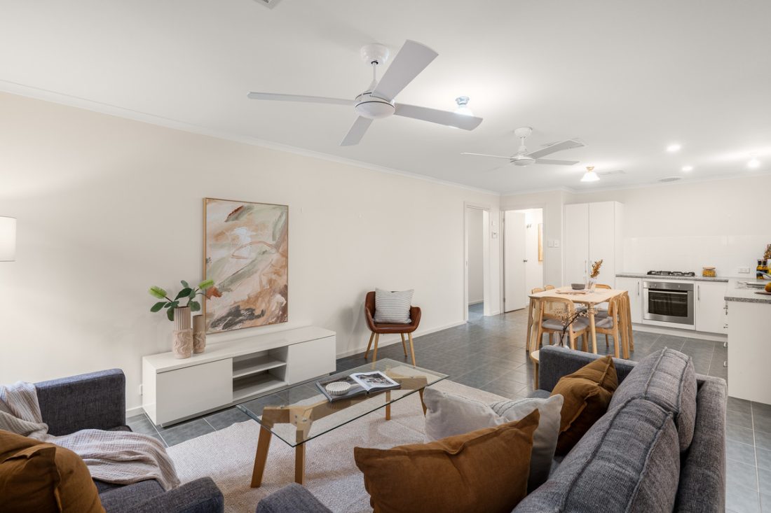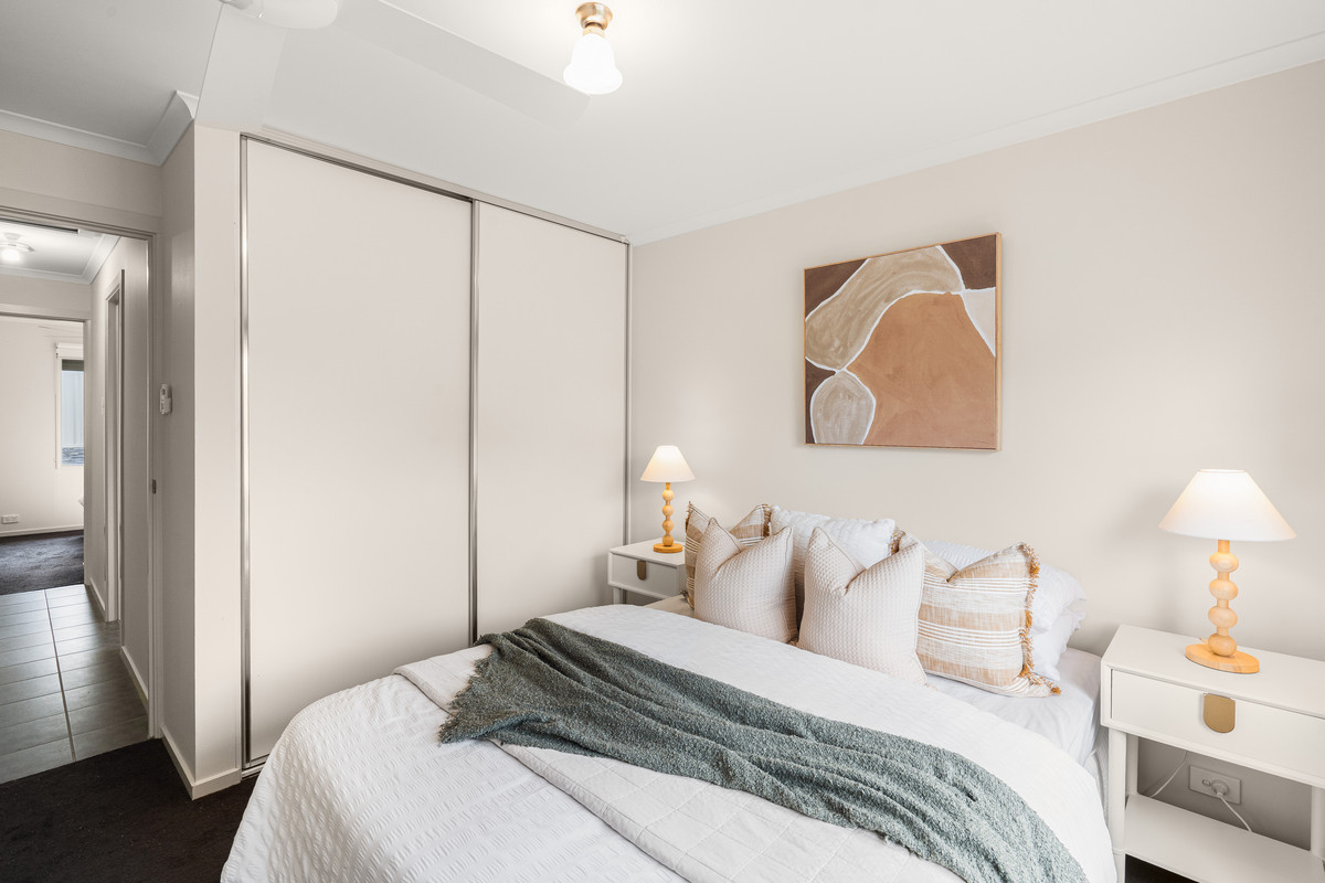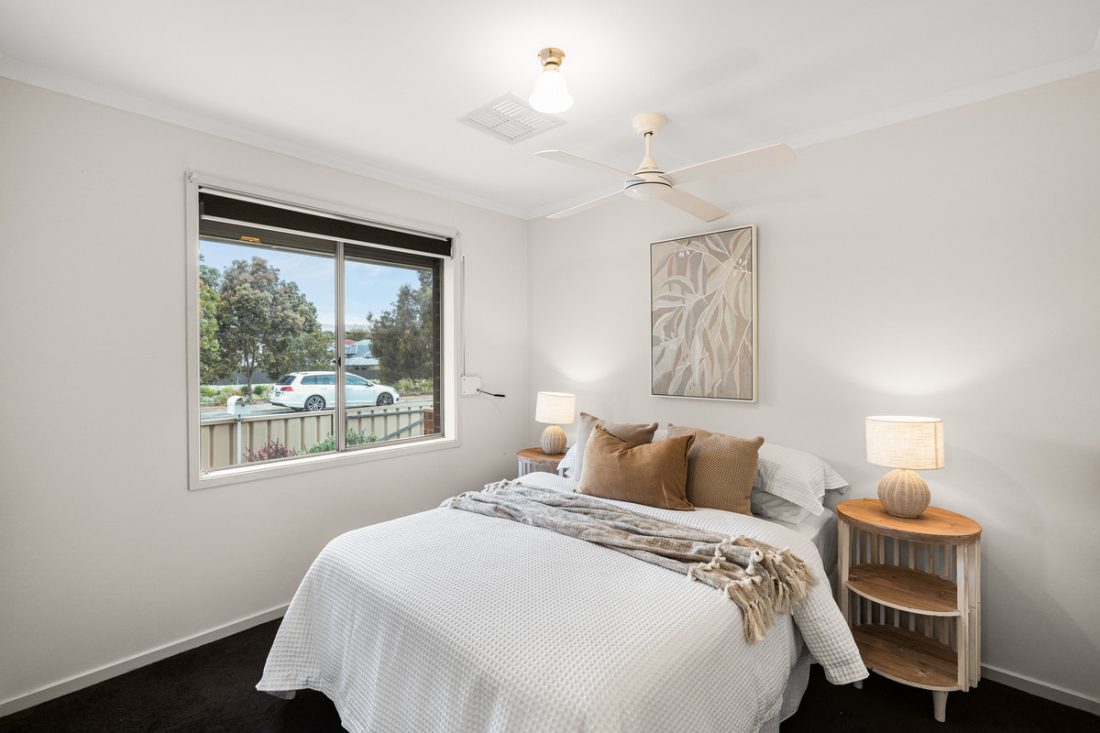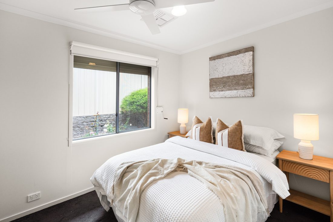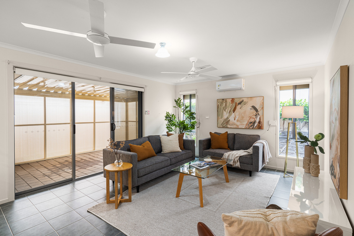 Soft white walls and ceiling fans throughout keep things fresh, while a split-system air-conditioner in the living area ensures year-round comfort. Two of the bedrooms feature built-in robes, adding to the home’s everyday ease.