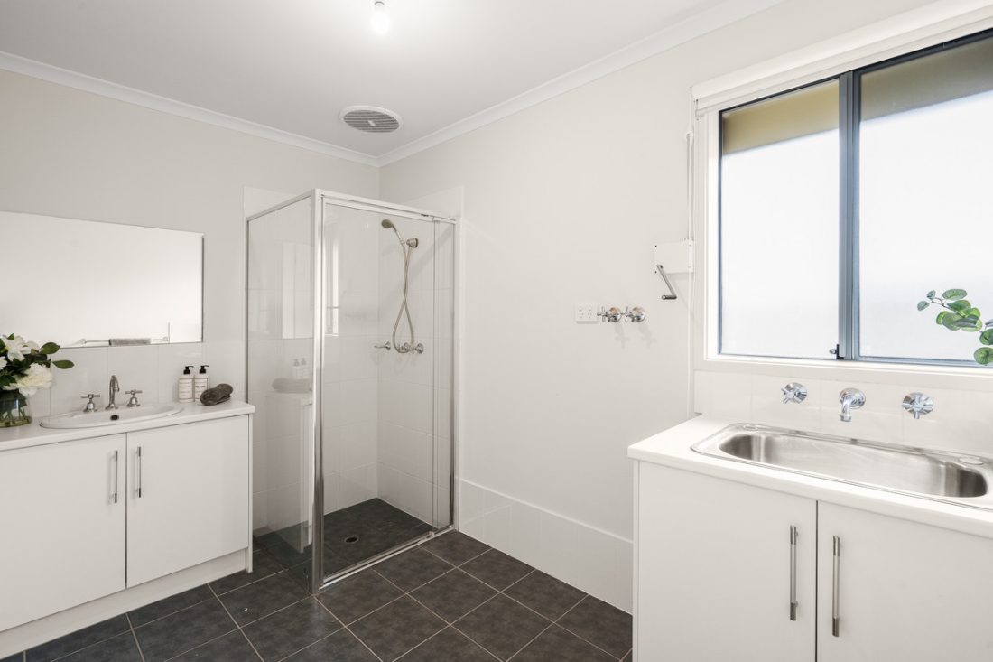 The integrated bathroom and laundry combine function and convenience, complete with dual sinks and a full-sized shower.