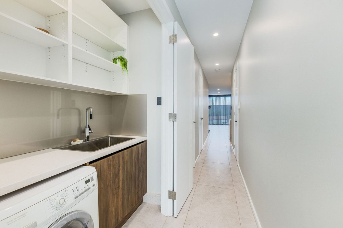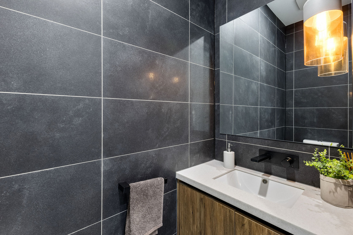 Completing the lower level is a beautifully designed powder room with floor-to-ceiling tiling and sleek fixtures, a European-style built-in laundry, and handy under-stair storage.