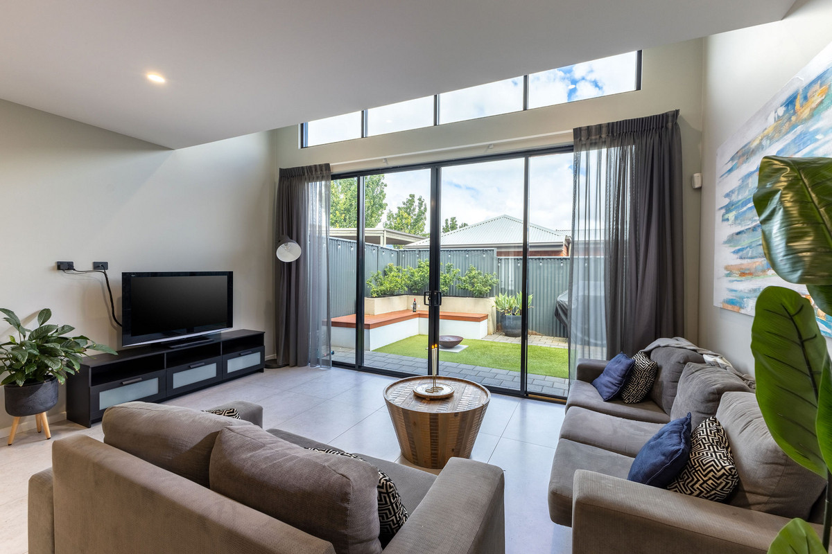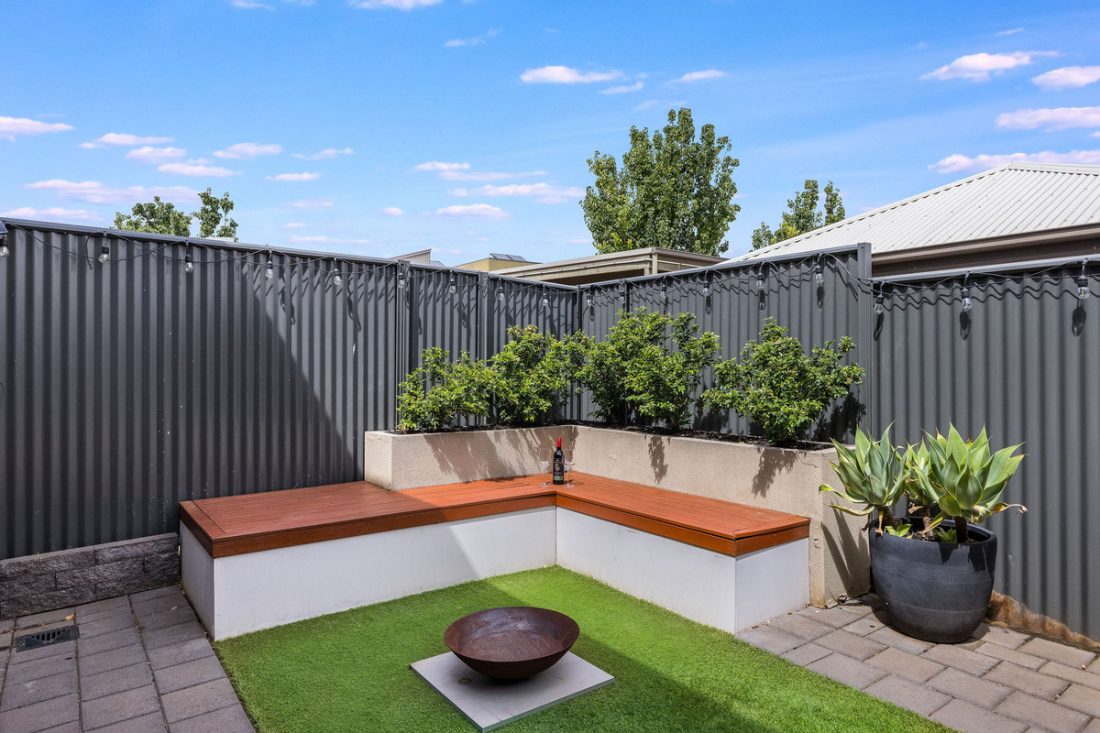 Sliding glass doors seamlessly connect the indoors to the backyard, where a cozy, low-maintenance space awaits. With a touch of greenery and built-in bench seating, this outdoor retreat is perfect for unwinding with minimal upkeep.